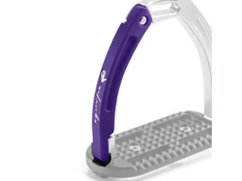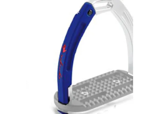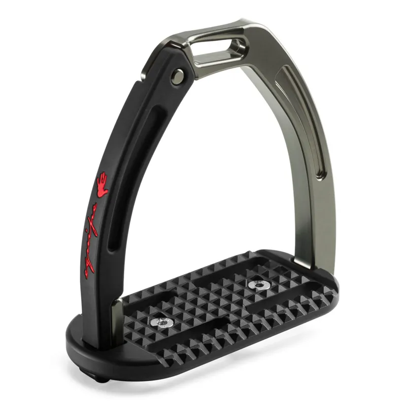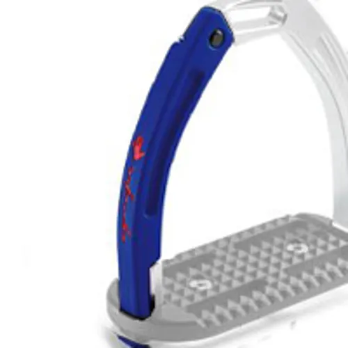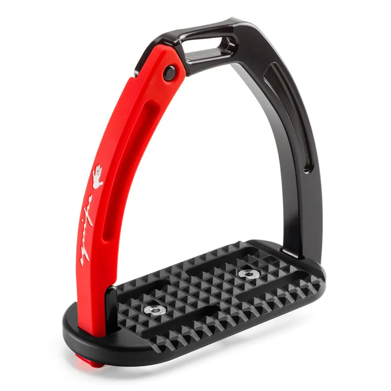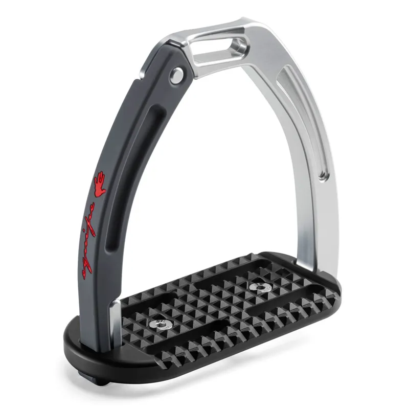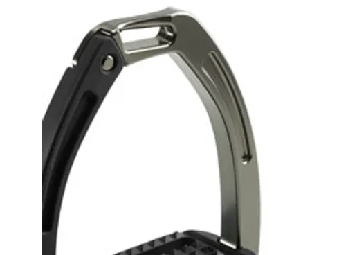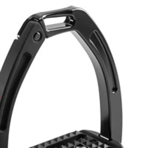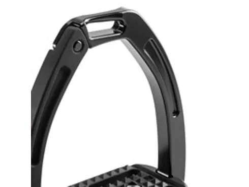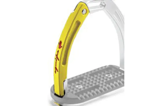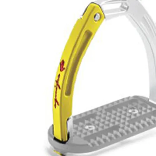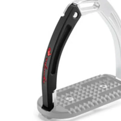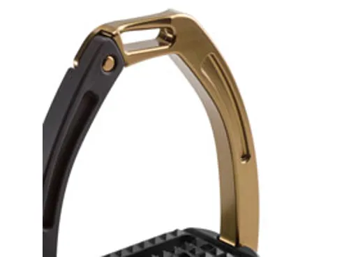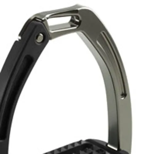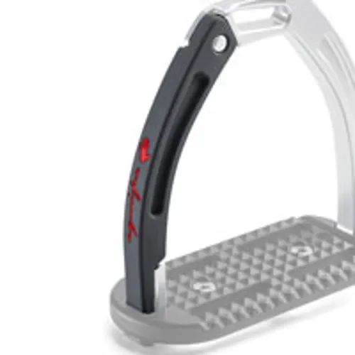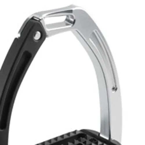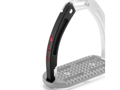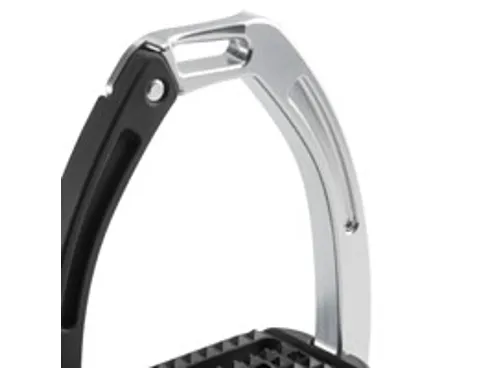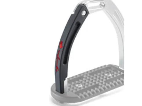 These high performing stirrups feature a mobile silicone arm which is securely engaged at the top into a built-in pin on the fixed gullet, which releases under pressure during a fall. The lower section of this silicone arm is set between the stirrup tread and gullet. which is designed to prevent it from loosening under conditions of normal use, but in case of a fall, it can be easily extracted.