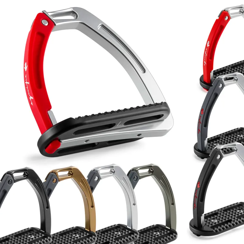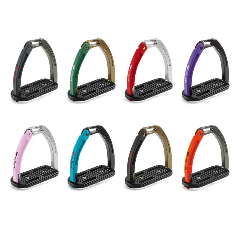 Characterised by their aesthetic lightness and eye-catching styling, these stirrup feature an innovative simple release system. This system has no springs, hooks or magnets that are at risk of breaking or getting stuck, and does not require any tools to restore to it's original positioning after a fall.