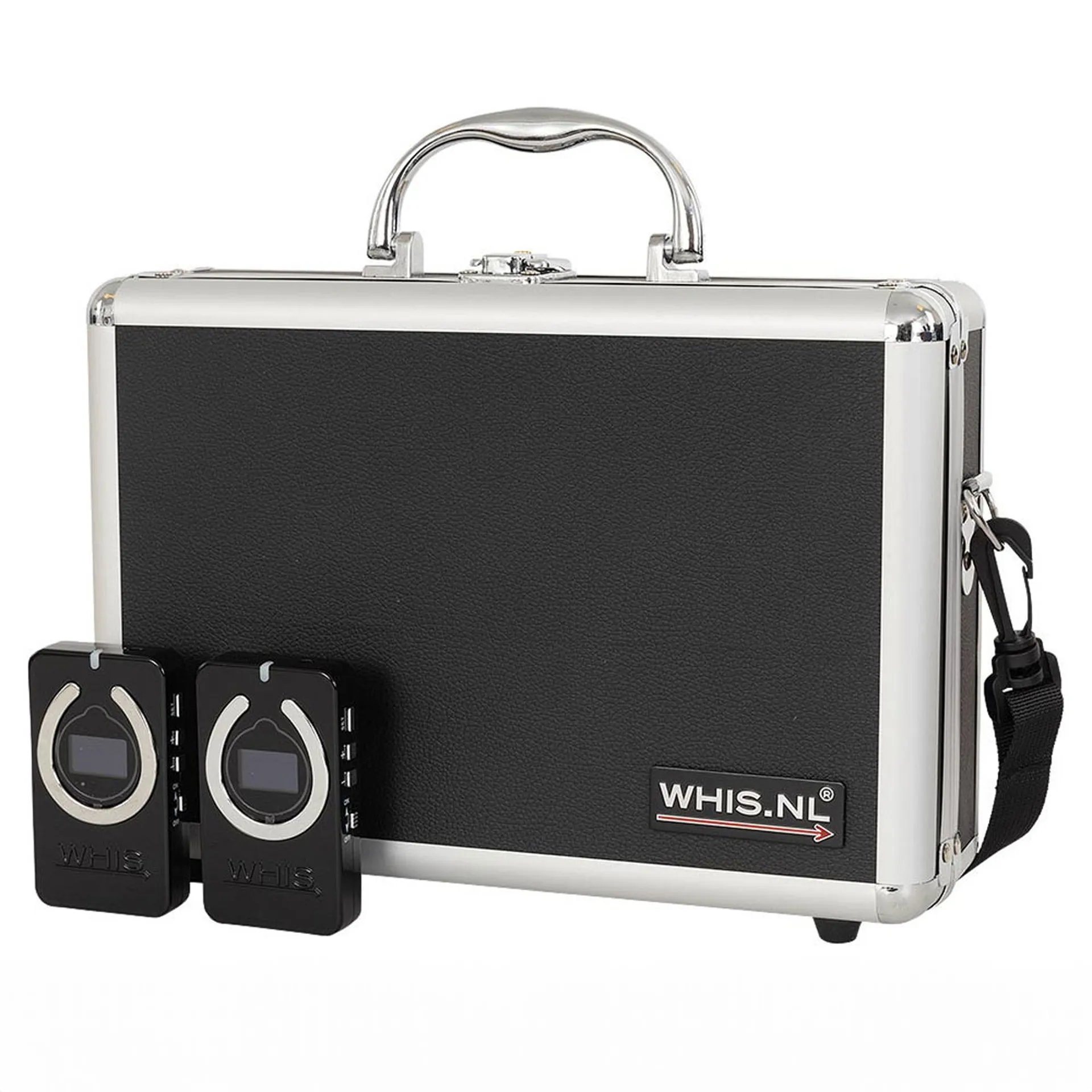 This set includes: 2x WHIS® Competition devices (one for the rider, one for the instructor), 4x headsets with built-in connectors, 1x twin charging cable, 1x charging plug with international adaptors, and a lockable travel case.