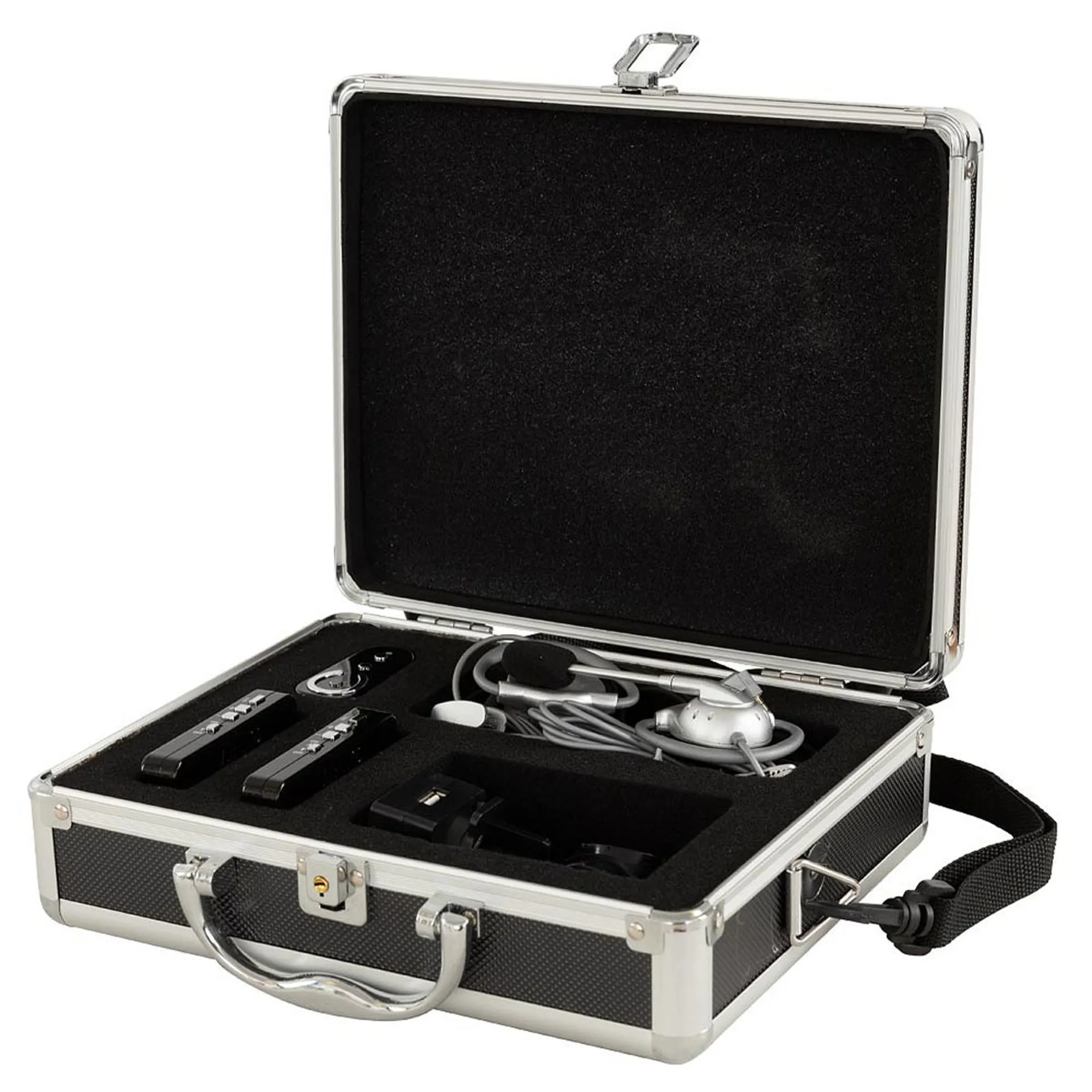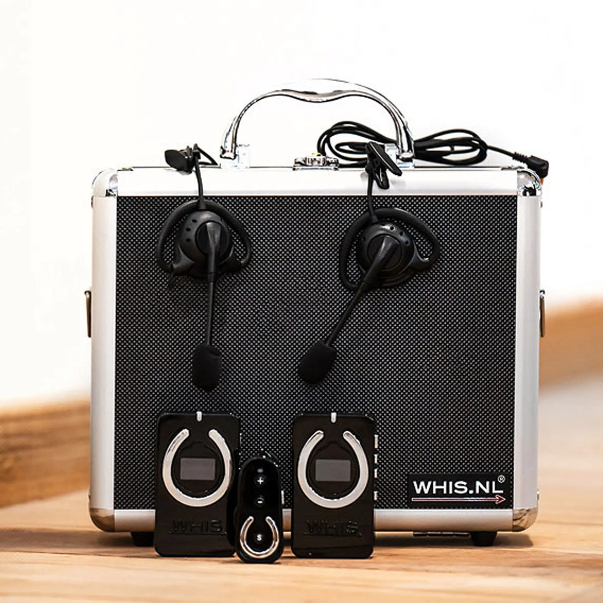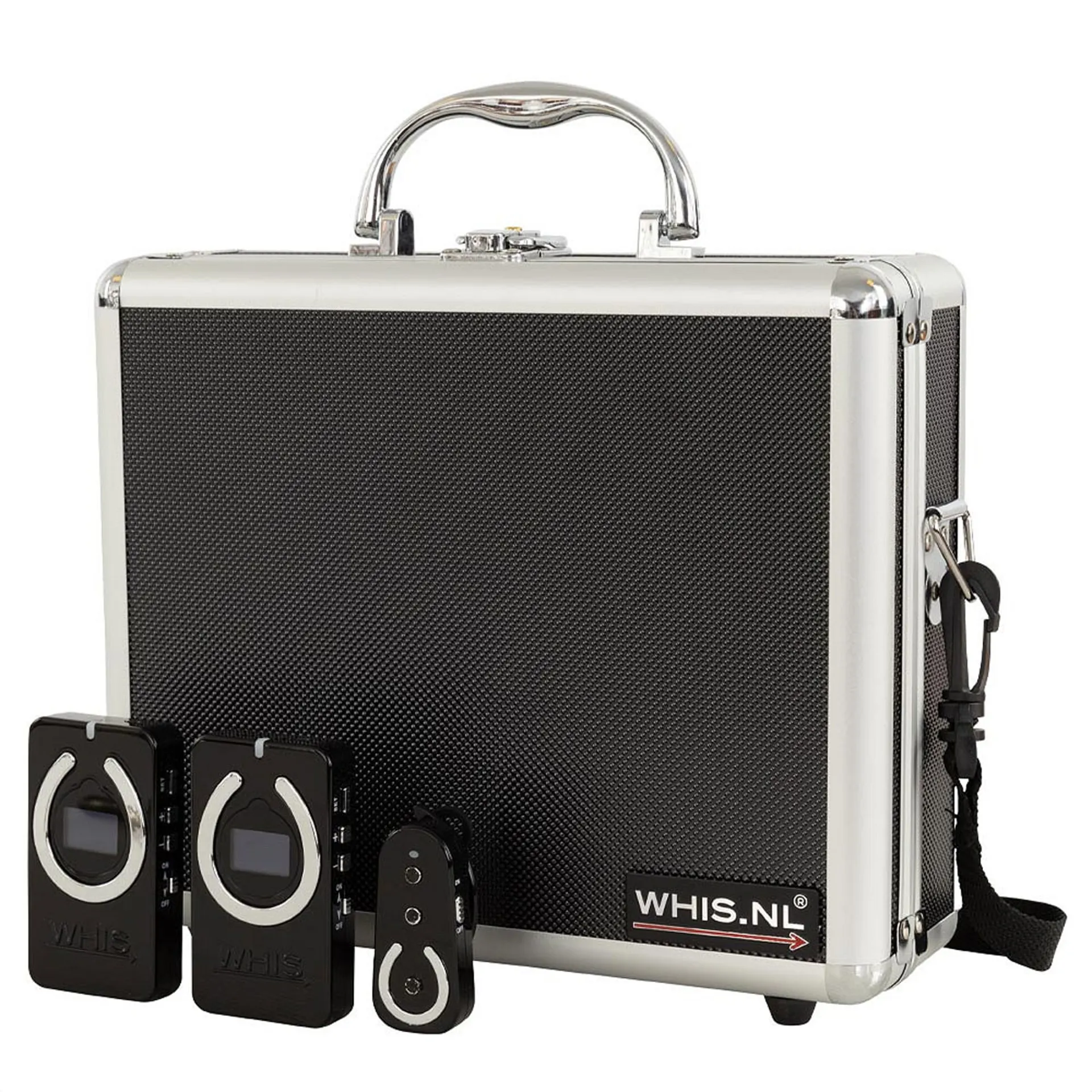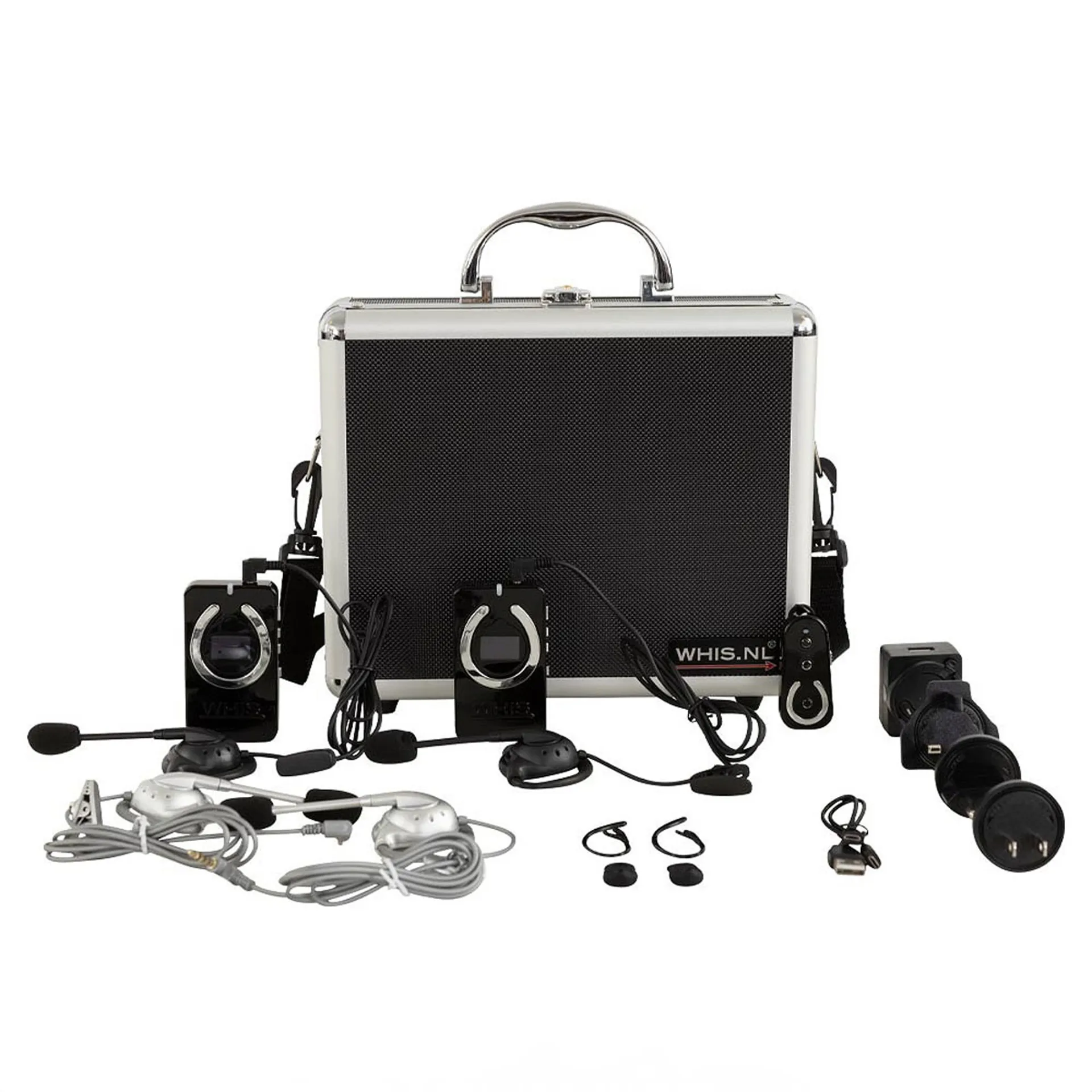 This set includes: 2x WHIS® Competition devices, 1x WHIS® Wireless 2-way device, 4x headsets with built-in connectors, 1x twin charging cable, 1x charging plug with international adaptors, and a lockable travel case.