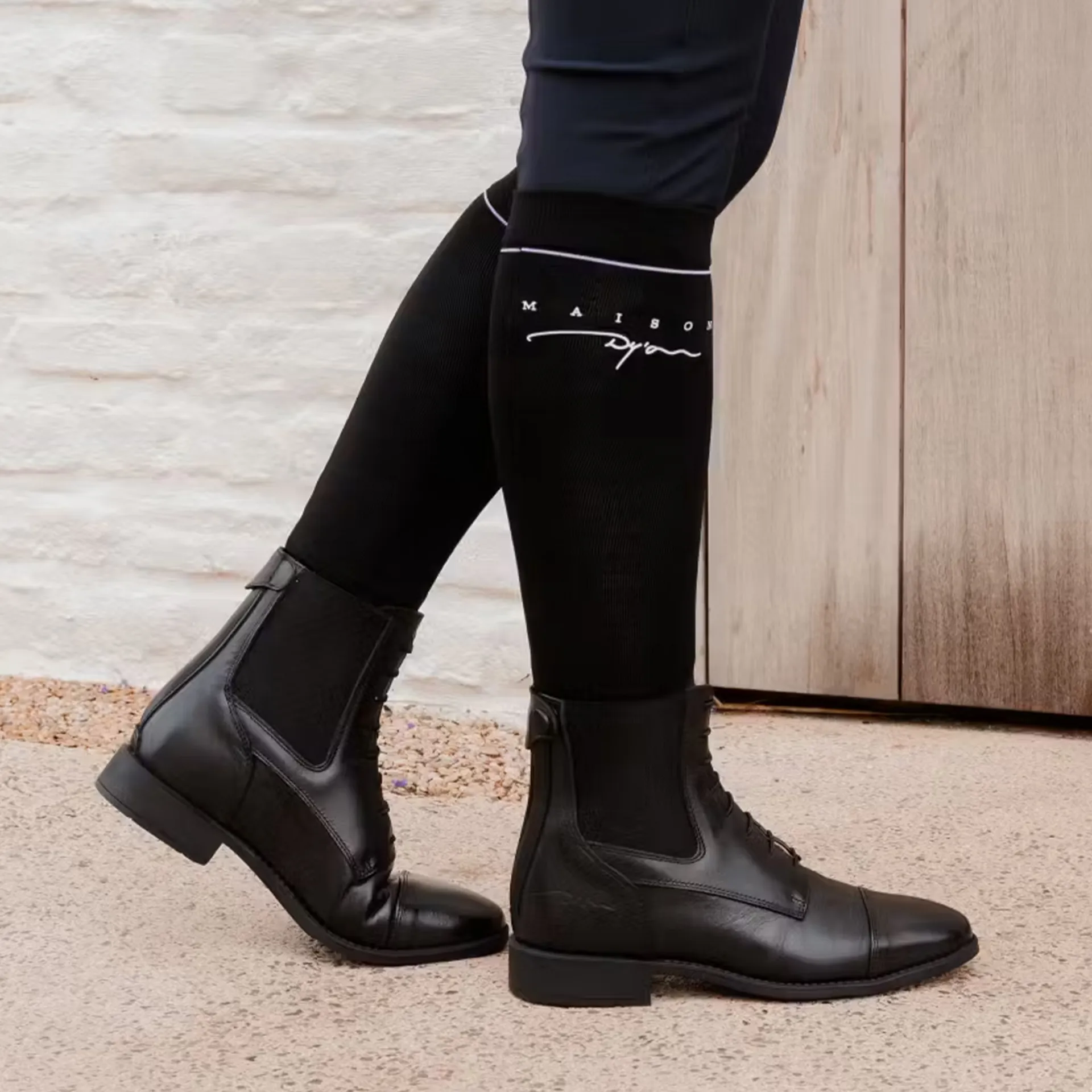 The Dy'On Unisex Riding Socks are designed for riders who demand performance and style. Lightweight yet durable, these ultra-thin socks slide easily under boots or chaps with no bulk or bunching, while the high elastic design provides a secure fit for every leg type. Perfect for riding, yard work, or everyday wear, they’re finished with the subtle Maison Dy’On logo for a classic, premium touch.