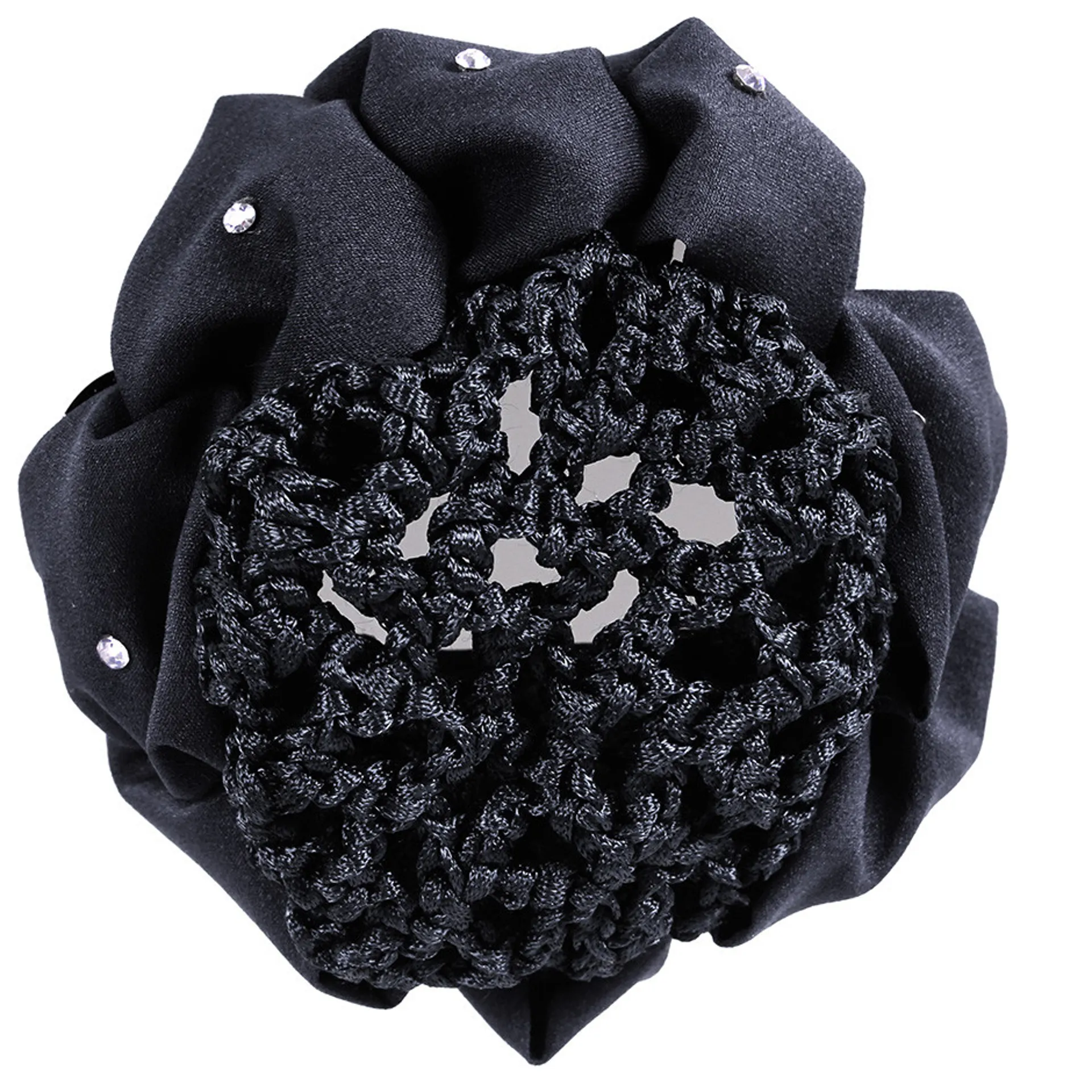 The QHP Flower Hair Bow combines a delicate mesh hair net with a pleated fabric scrunchie, exquisitely adorned with small silver rhinestones for a touch of sparkle. It is designed to effortlessly clip at the back, ensuring a secure and comfortable fit while adding an elegant finishing touch to your look.