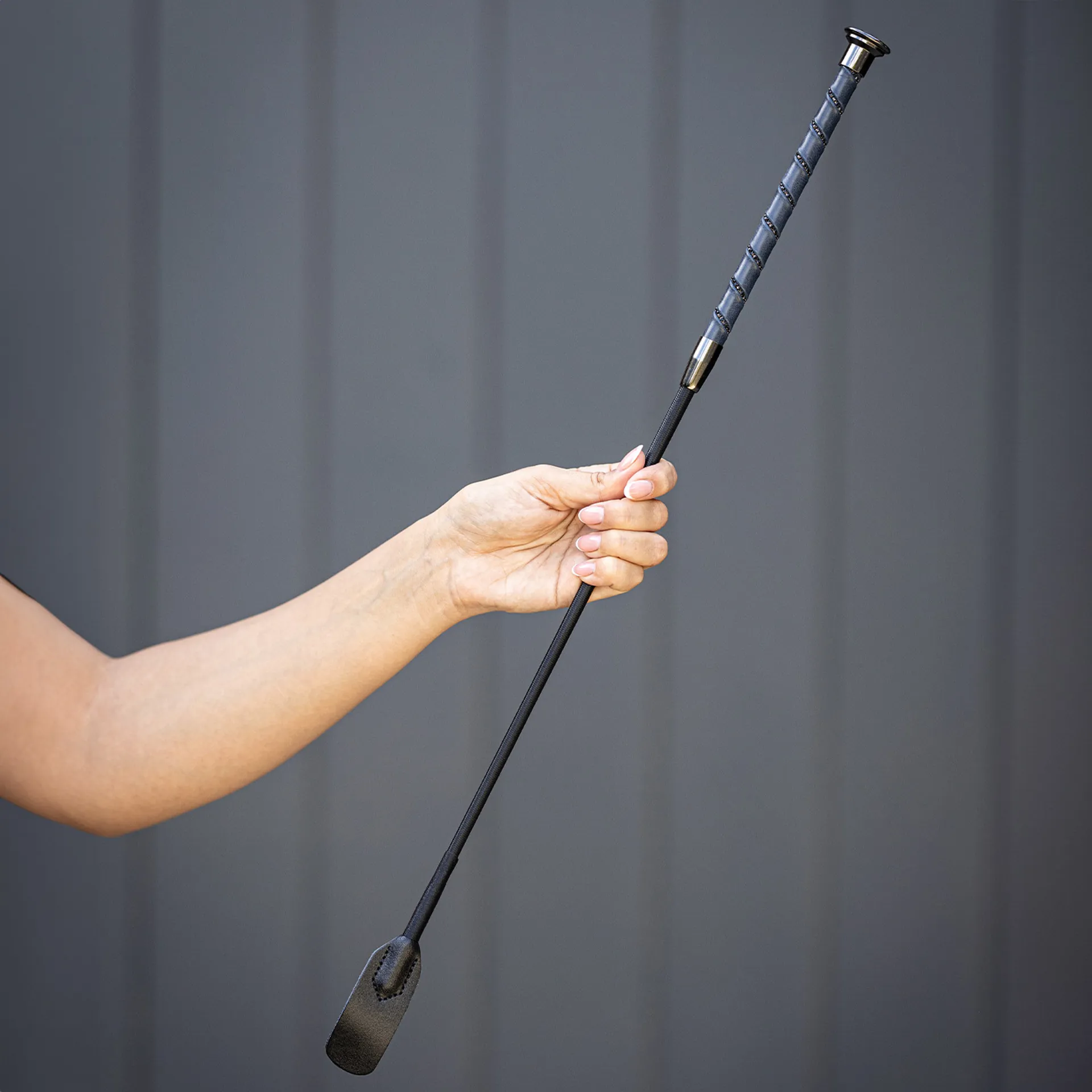 Designed for riders who appreciate understated elegance, this 60cm tool is the Woof Wear Stealth Riding Whip, which provides a confident hold with its crystal-detailed grip and offers reliable control for everyday riding with a premium, durable finish.