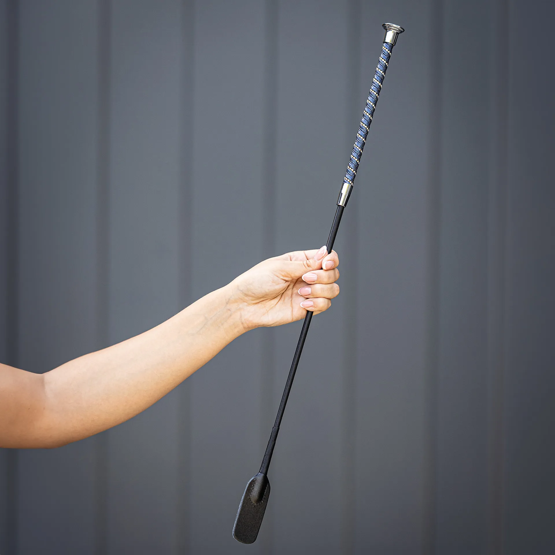 Question(s) answered about Woof Wear Twisted Riding Whip - Navy/Silver