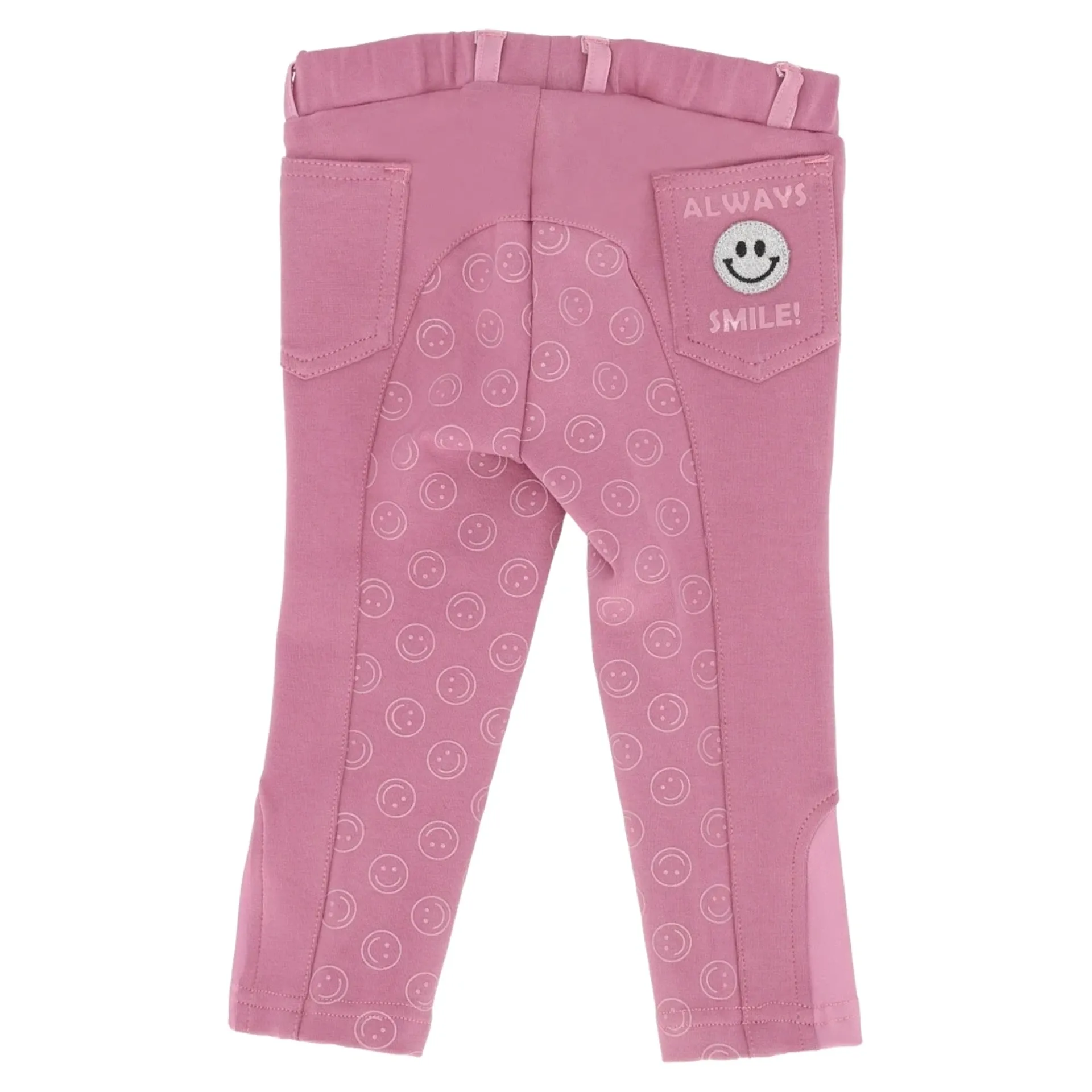 The QHP Rosalynn Junior Girls Breeches are designed specifically for young riders, featuring a full grip seat with a fun smiley print. These breeches are part of the Rosalynn collection and include playful details like a patch on the leg and the text 'Always Smile' on the back.