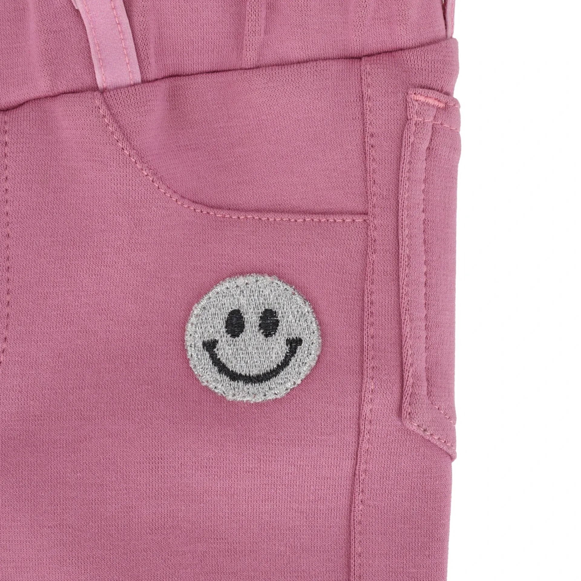 • Right pocket features the text 'Always Smile' and a smiley patch