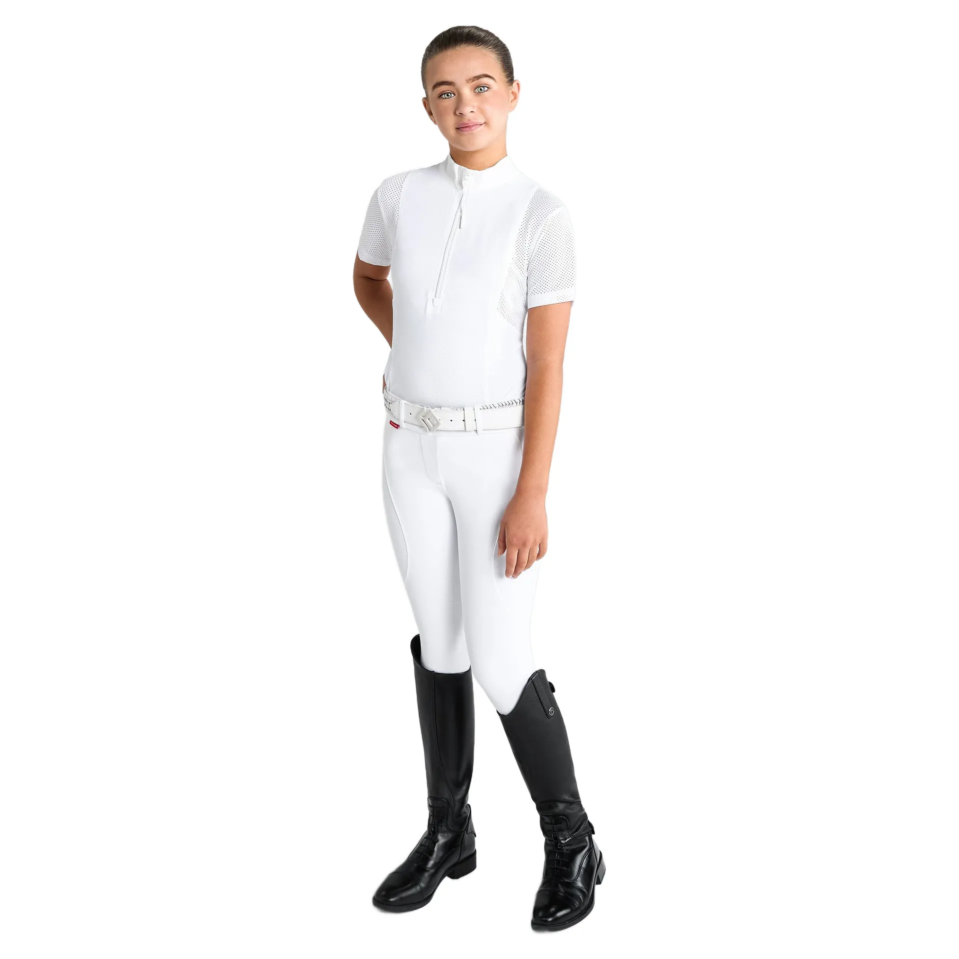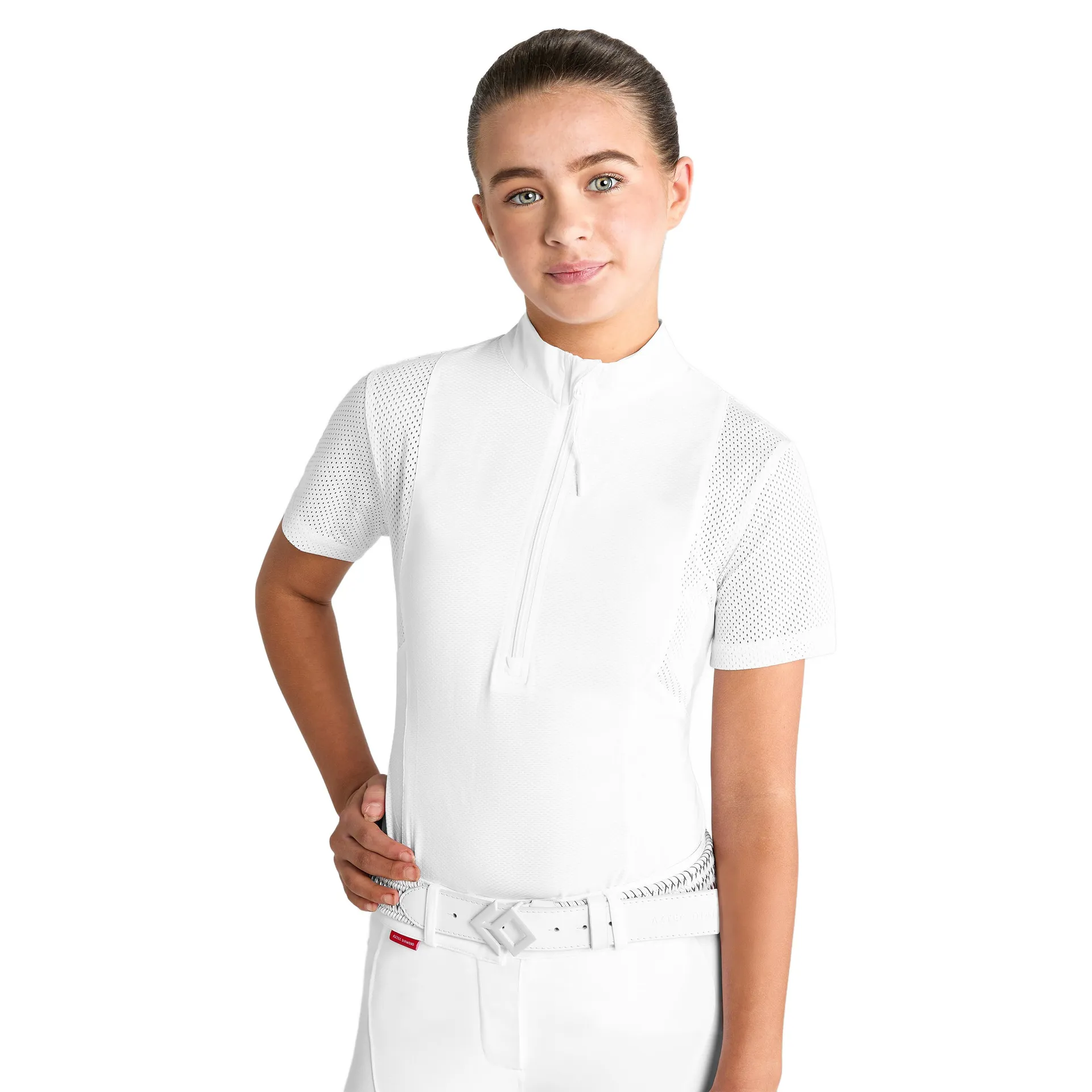 Question(s) answered about Aztec Diamond Young Rider Insert Mesh Show Shirt - White