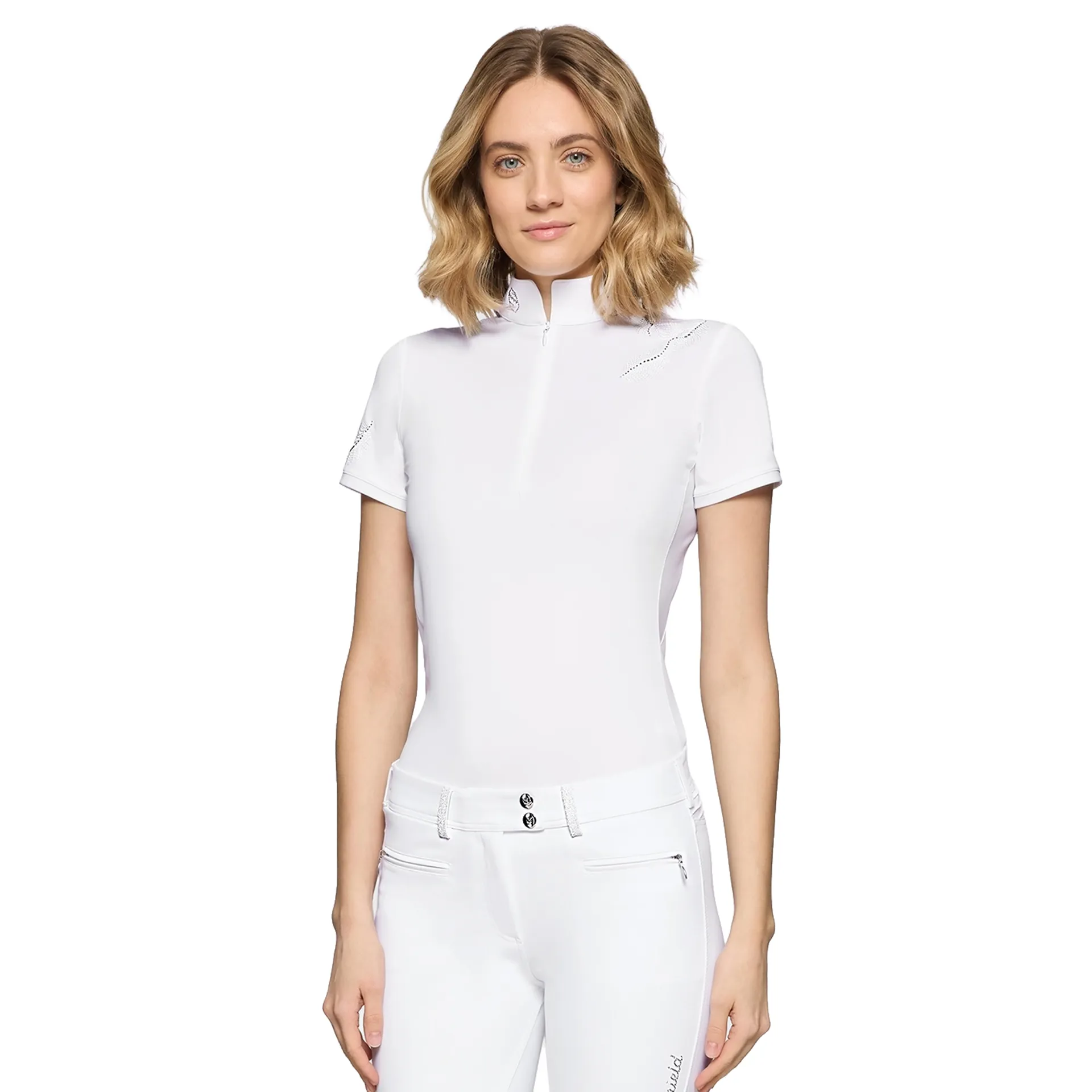 The Samshield Lea Ferna Crystal Womens Short Sleeve Show Shirt combines refinement and technicality for competition. Made from technical Italian fabric, it offers exceptional softness and elasticity for freedom of movement. The slim fit and standard waist provide a feminine silhouette, while tone-on-tone embroidery with Swarovski crystals on the sleeve and shoulder adds a bright, refined touch.