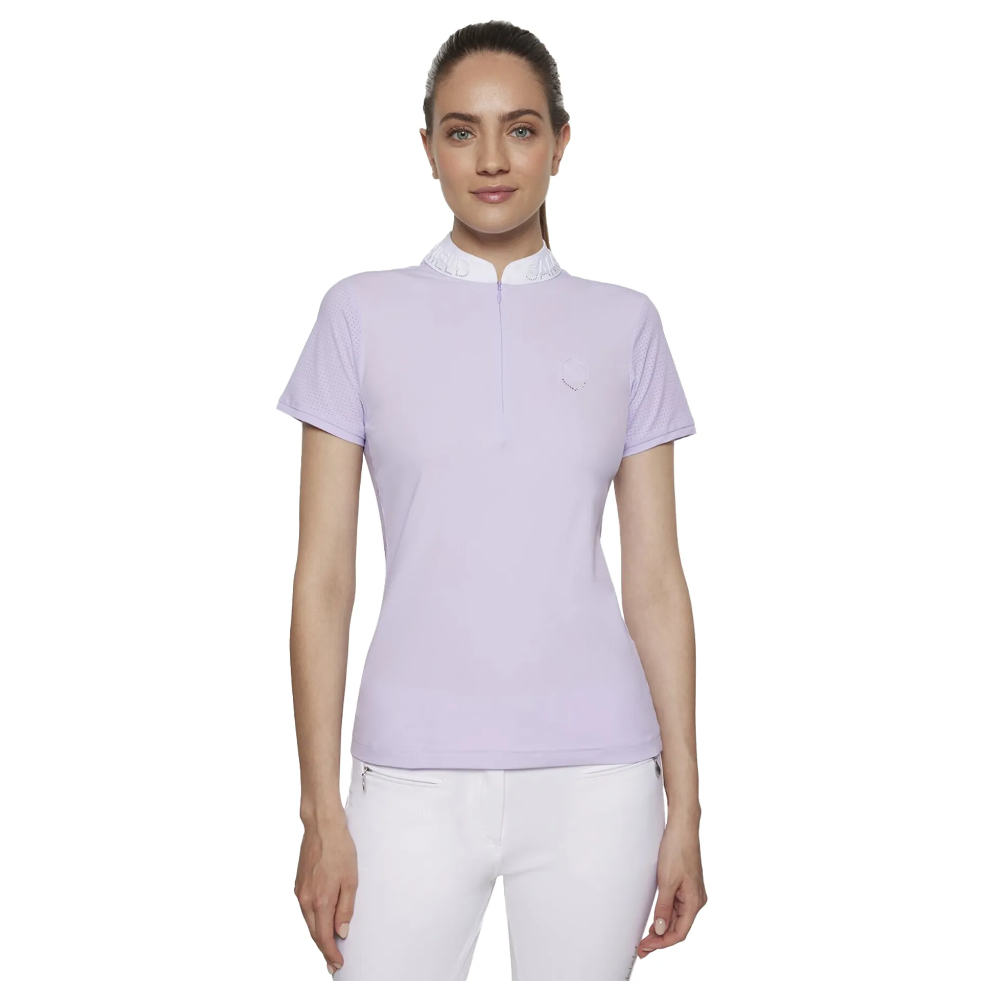 Made from breathable, quick-drying, stretch fabric with UPF 50+ sun protection, the Samshield Paloma Show Shirt blends elegance and performance with a 3D Swarovski® blazon, crystal collar detail, and invisible zip.