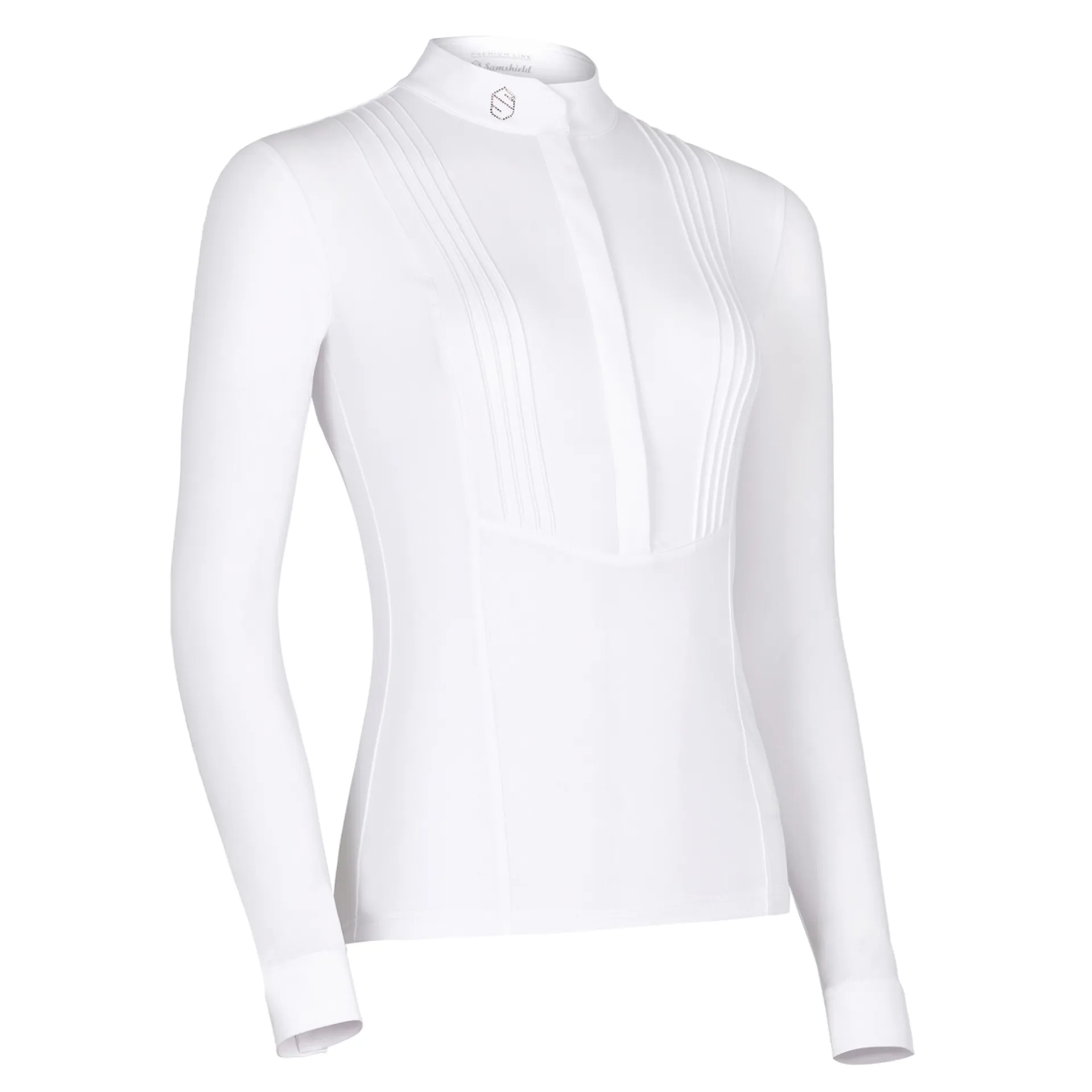With an eye-catching pleated front design and crisp collar with Swarovski® logo branding, the Sophia Shirt would be a sophisticated choice for any competitive rider.