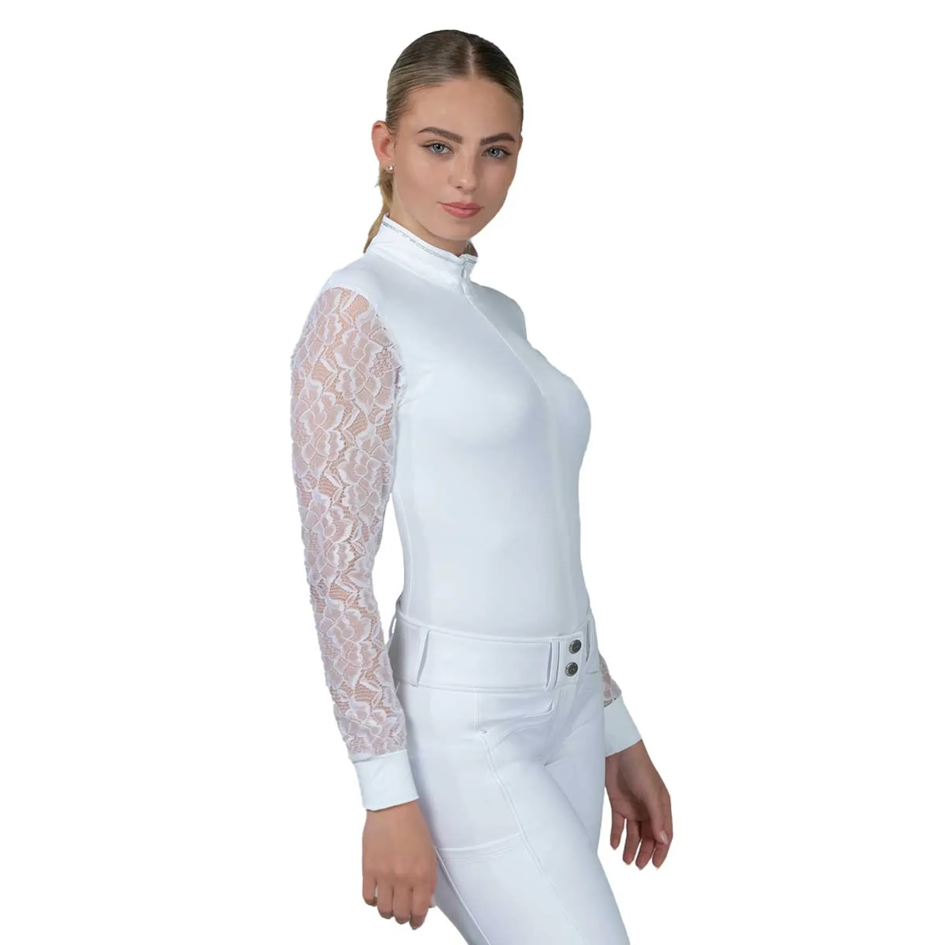 Question(s) answered about Schockemohle Alicia Womens Lace Sleeve Show Shirt - Optical White