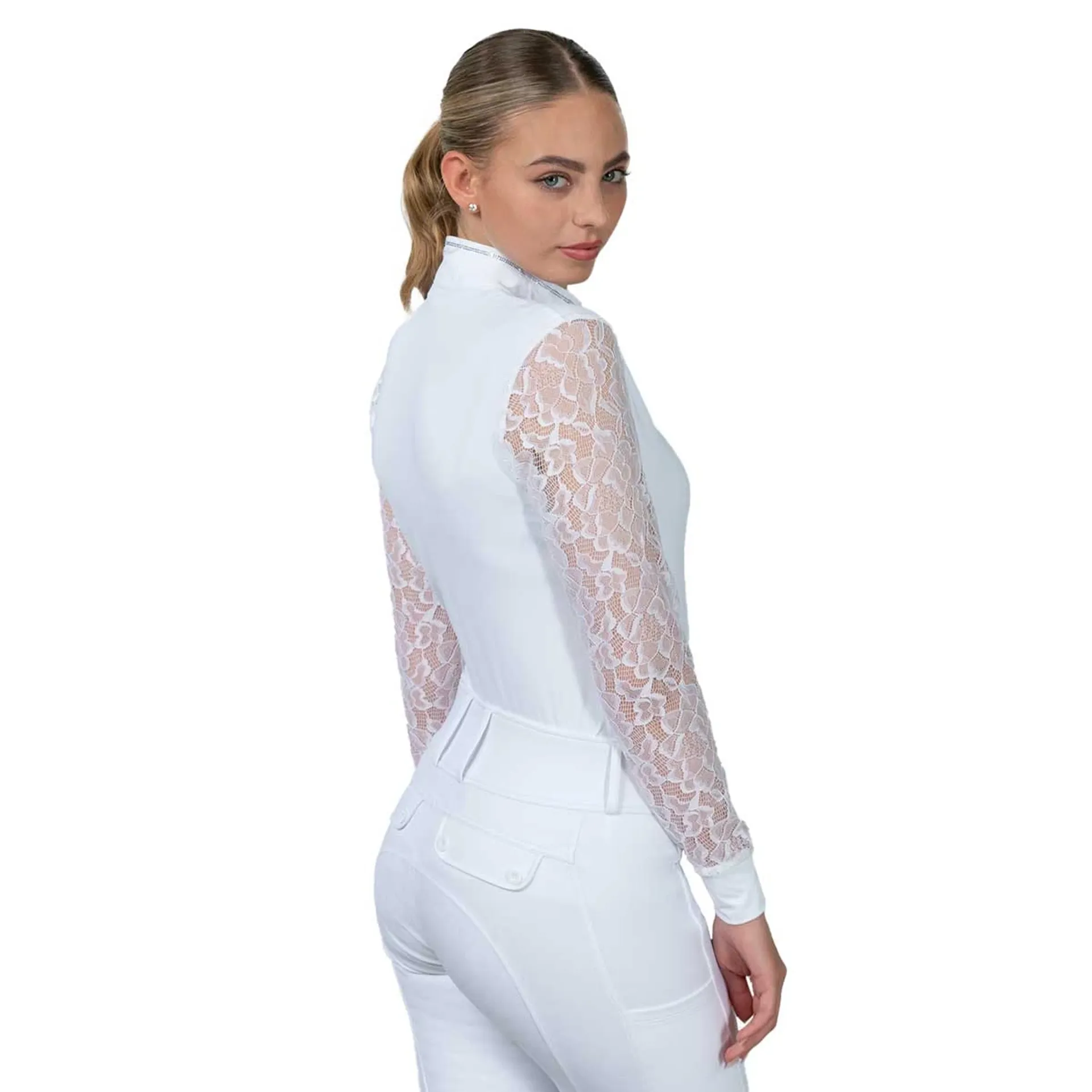 Question(s) asked regarding Schockemohle Alicia Womens Lace Sleeve Show Shirt - Optical White