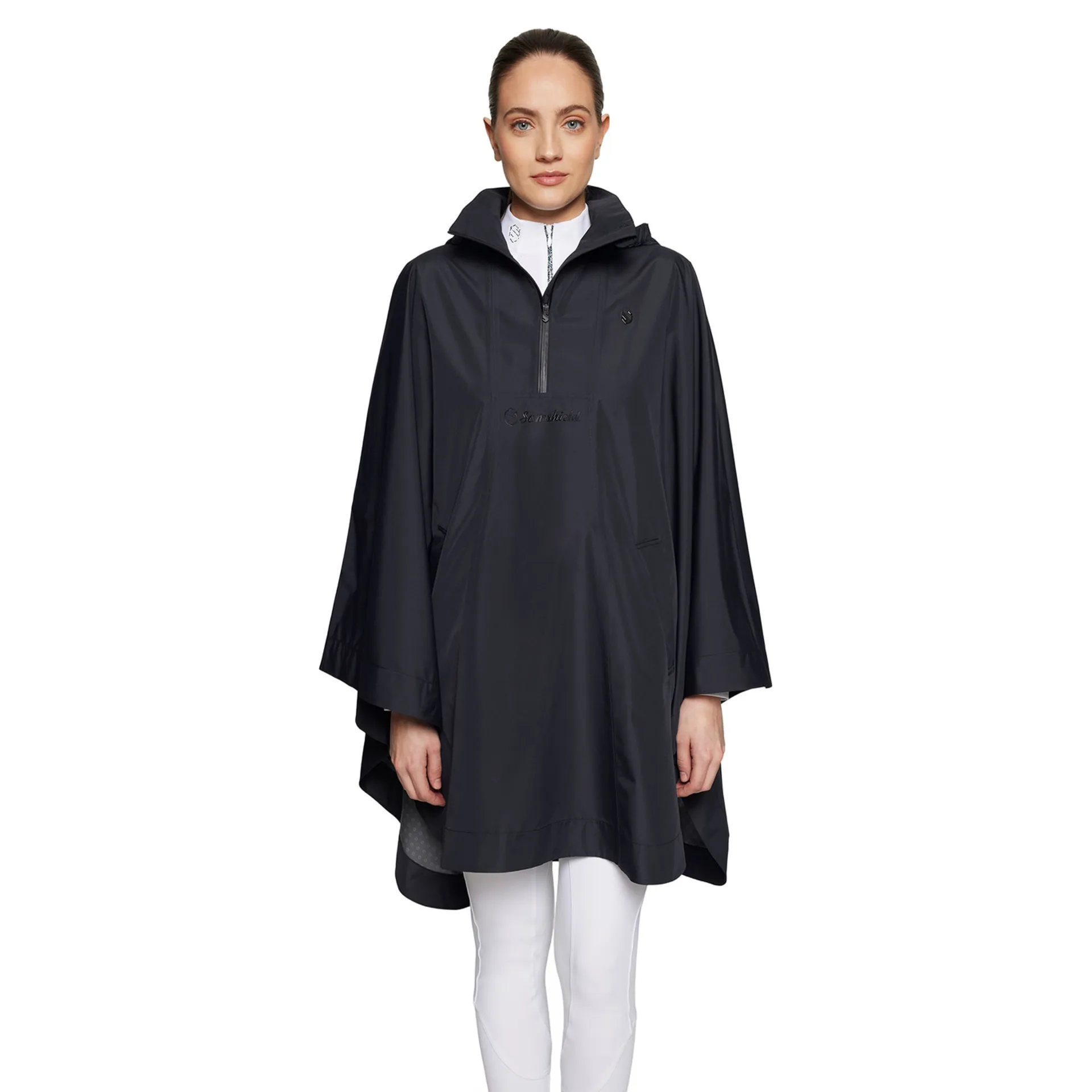 The Samshield Elfida Womens Rain Cape Jacket is a premium waterproof outer layer designed to keep riders protected, comfortable, and stylish in wet and windy conditions, whether training at home, hacking in unpredictable weather, or walking the course at competitions. Created with a flowing cape silhouette, this innovative jacket allows complete freedom of movement in and out of the saddle, making it ideal for riders who need reliable protection without restriction. The loose fit drapes effortlessly over riding attire, while the stand-up collar and half-zip design provide adjustable coverage and easy on-and-off wear. Thoughtfully engineered to adapt to the riding position, the magnetic sleeves and hood stay securely in place, ensuring uninterrupted comfort even in strong winds.