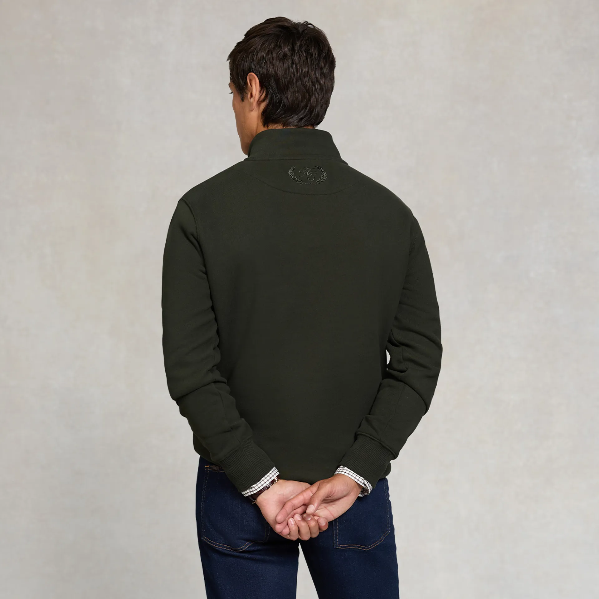 The Holland Cooper Henley Sporting Goods Men's Quarter Zip combines heritage-inspired detailing with everyday comfort, designed in a classic fit for timeless versatility. It features a quarter zip neckline with an HC-embossed zip pull for a refined touch, alongside a signature D-yoke panel with HC embroidery at the back.
