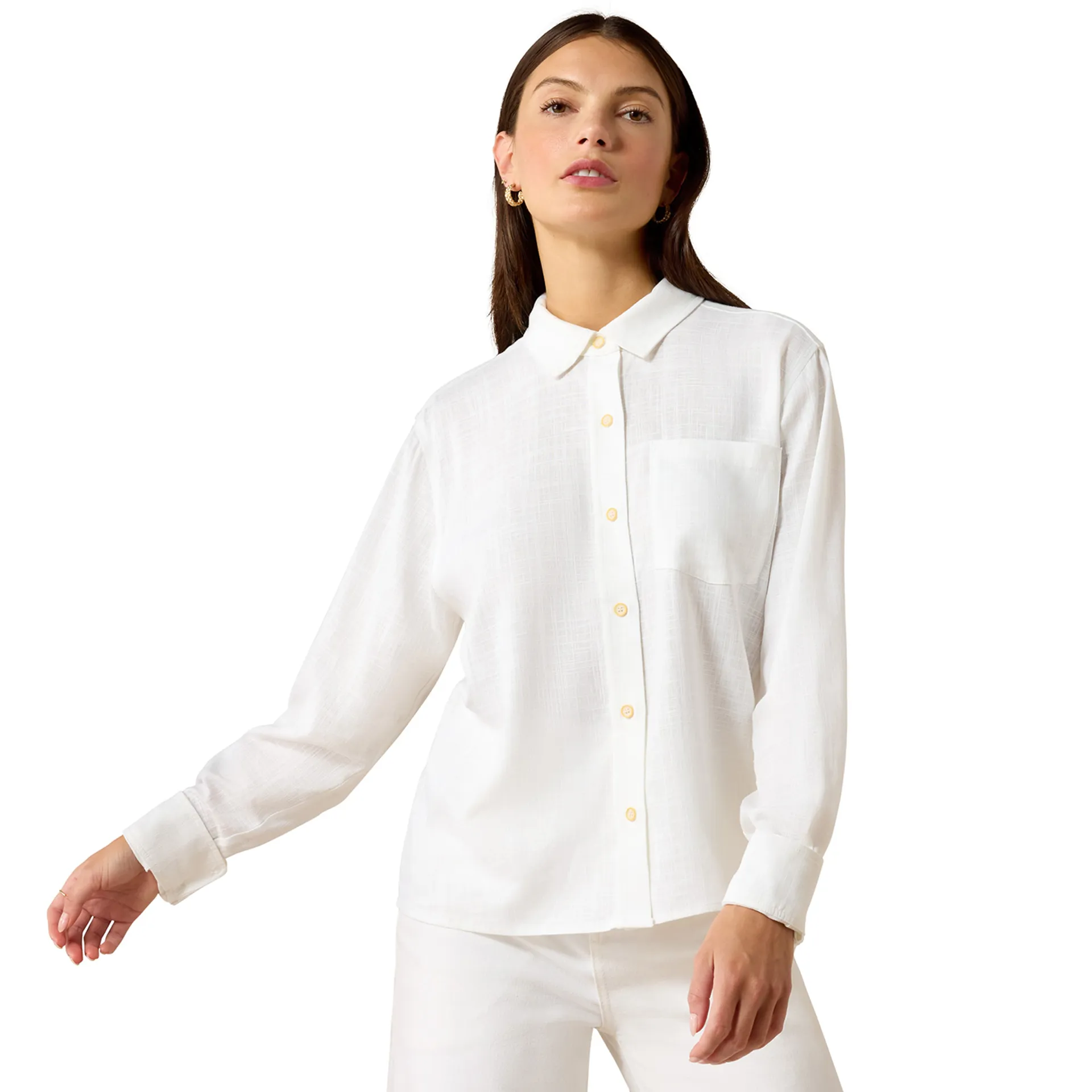 The Ariat Country Rudford Ladies Shirt offers a blend of casual elegance and comfort, making it an ideal choice for warmer days and versatile styling. Crafted from a lightweight linen-rayon blend, this shirt is breathable and soft to the touch, bringing a natural drape and easy feel to your look. Its relaxed fit and high-hip length create a flattering silhouette that pairs effortlessly with high-rise denim, skirts, or shorts.