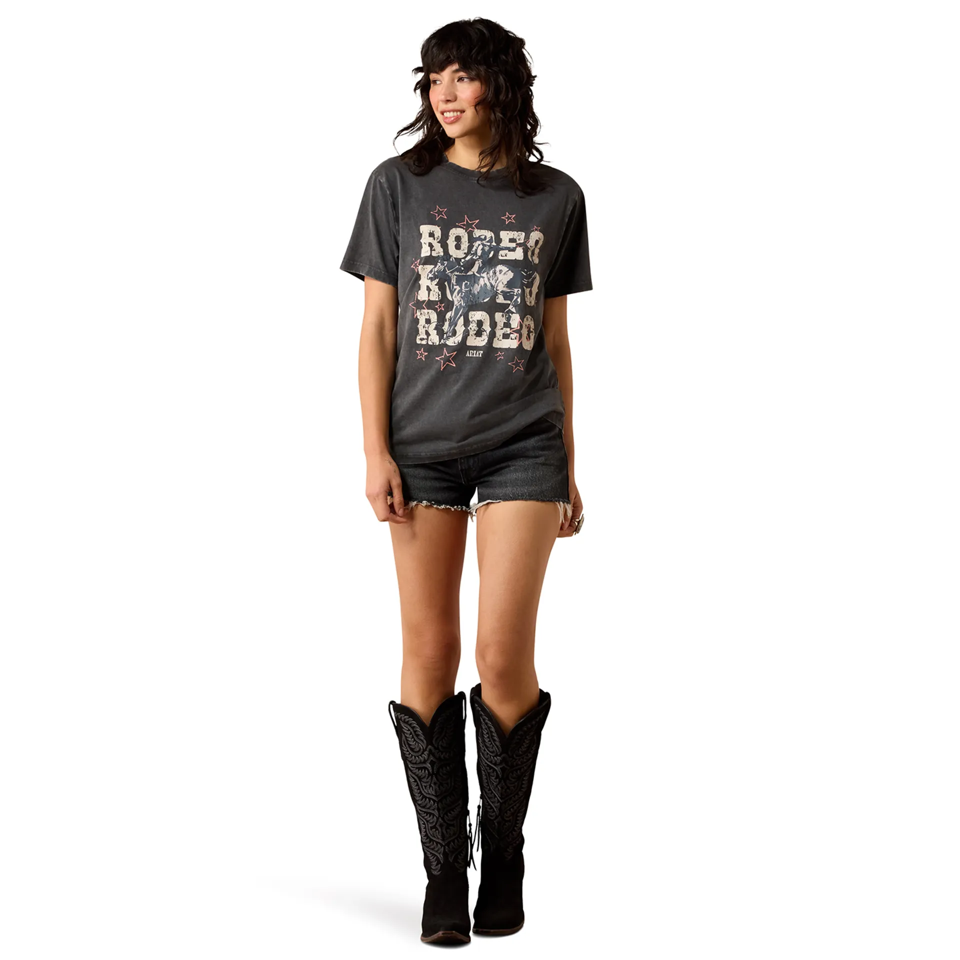 Question(s) asked regarding Ariat Star Spangled Rodeo Womens T-Shirt - Charcoal Mineral Wash