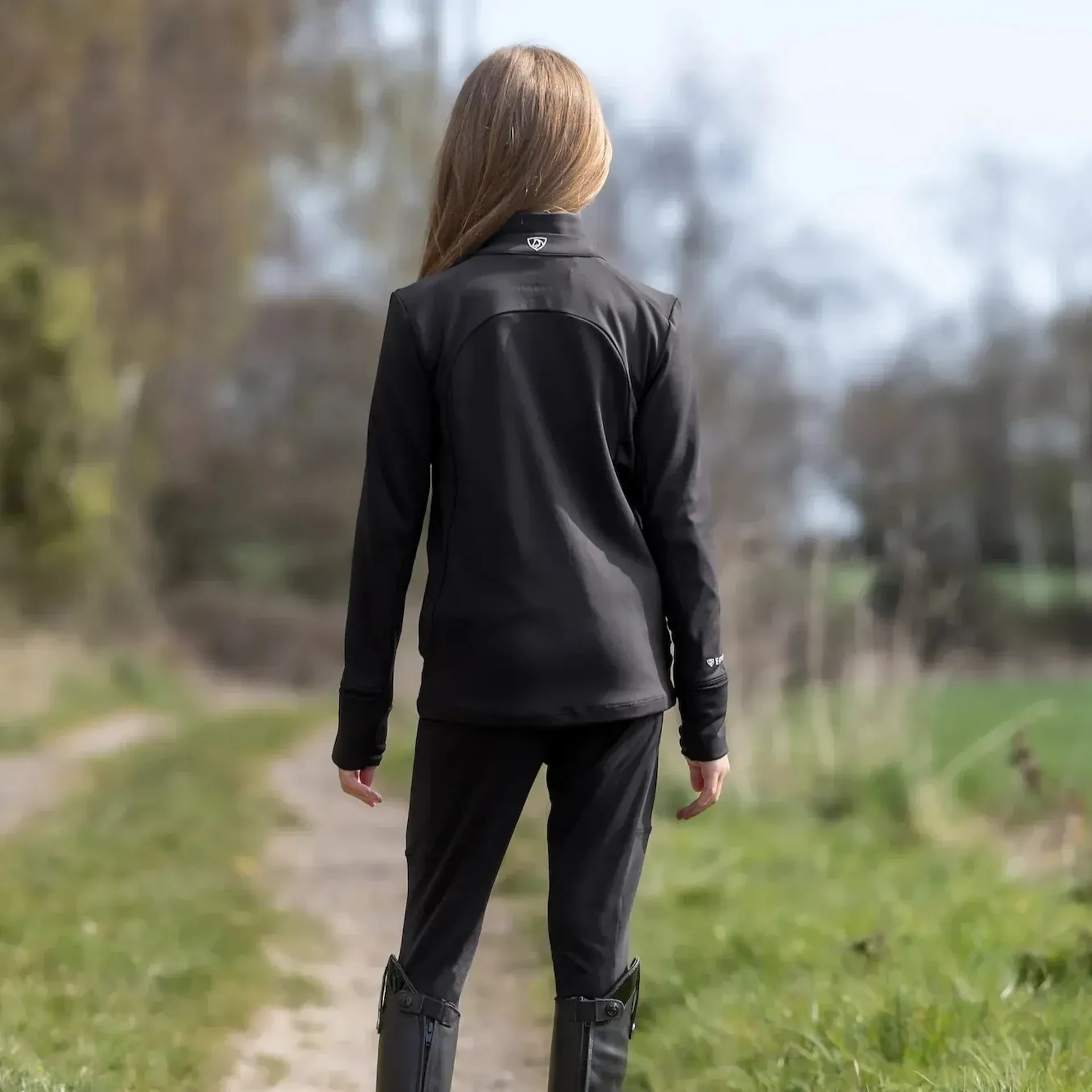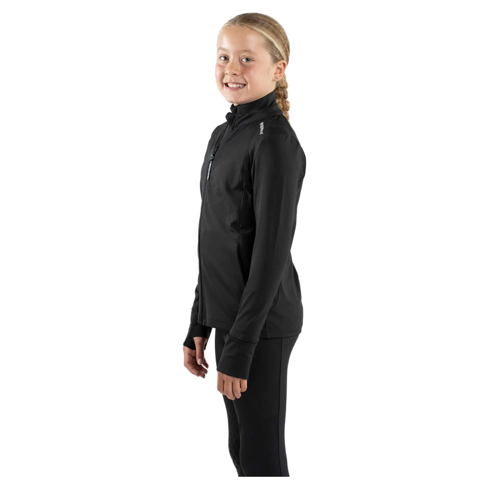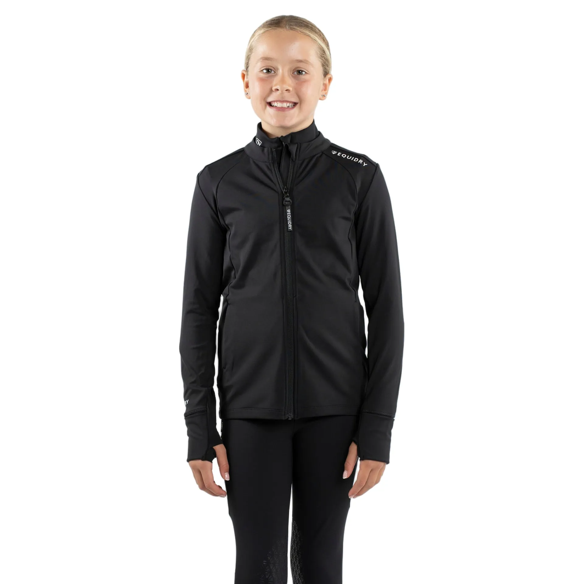 Question(s) answered about Equidry Junior Girls Full Zip Up Water Repellent Top - Black/White