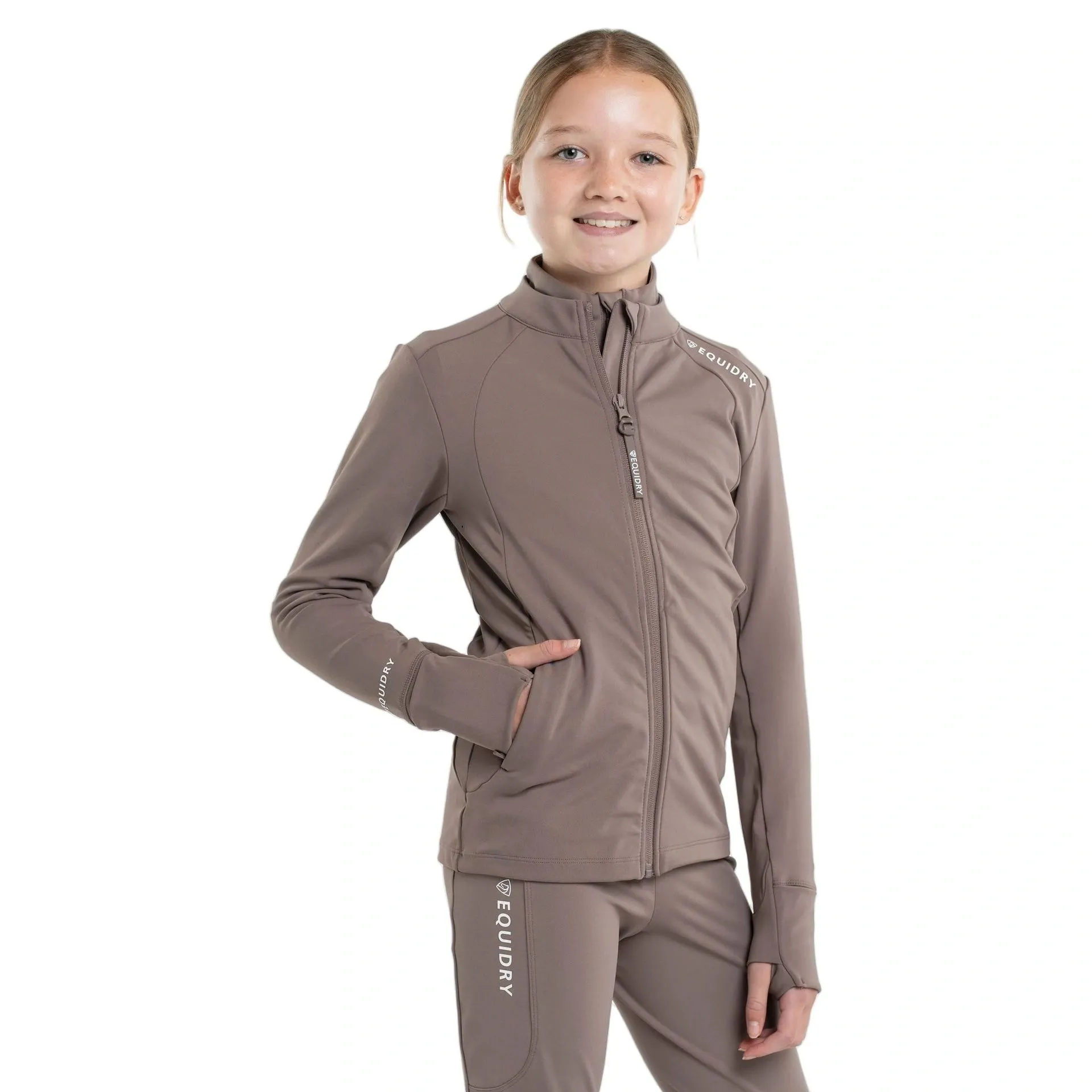Question(s) answered about Equidry Junior Girls Full Zip Up Water Repellent Top - Mocha/White