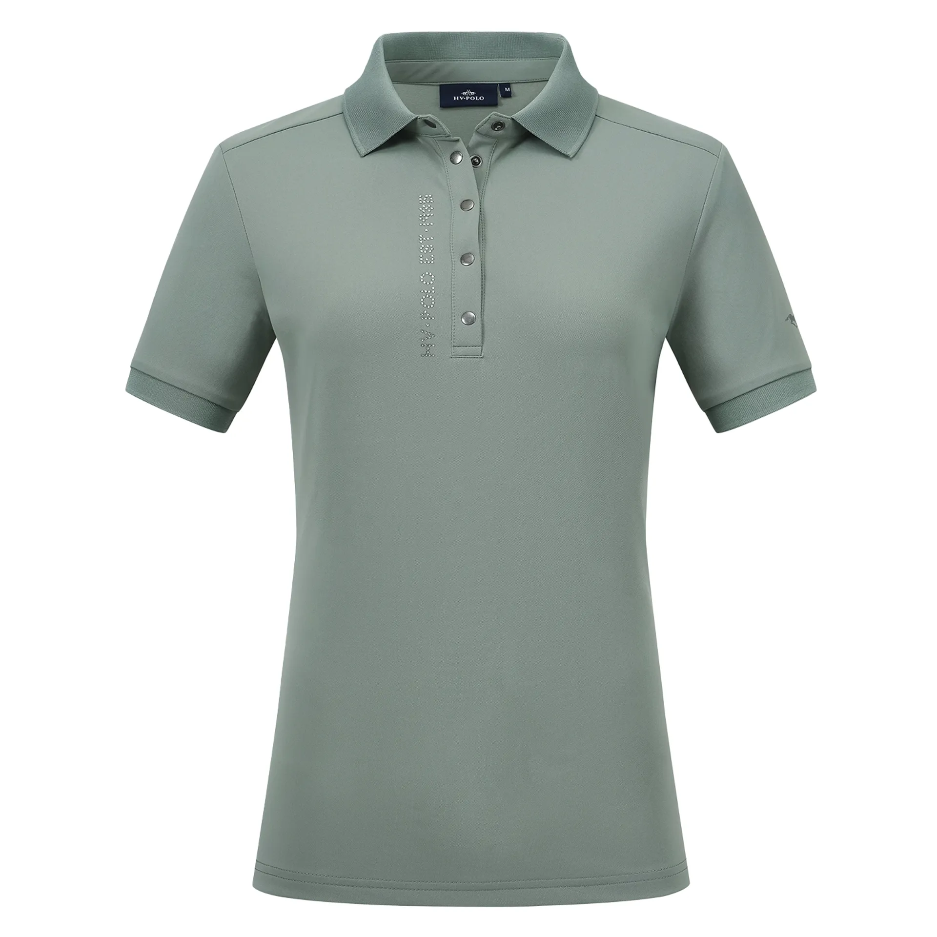 Stylish details, including rhinestone text on the chest and a metallic horse print on the sleeve, create a chic, sporty look. Designed with both fashion and function in mind, this polo is a must-have for any equestrian wardrobe.
