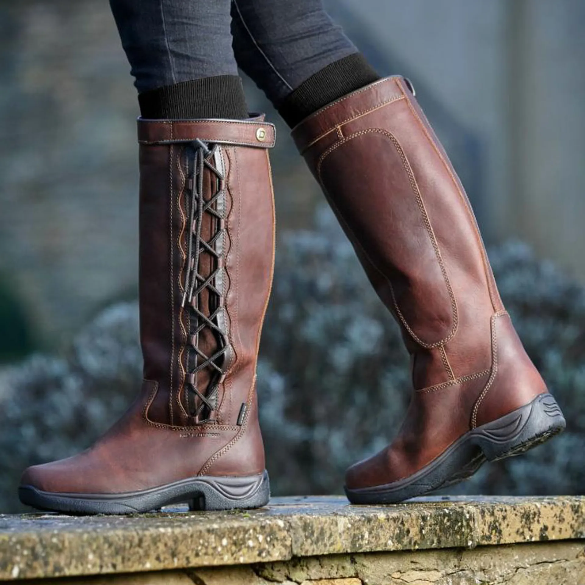 These boots feature a HBR® Waterproof and breathable nylon lining and a full grain leather upper. Lace adjustment and a touch-close fastening at the sides allows full adjustment, meaning you can get the perfect fit whether you wear them with jeans or breeches.