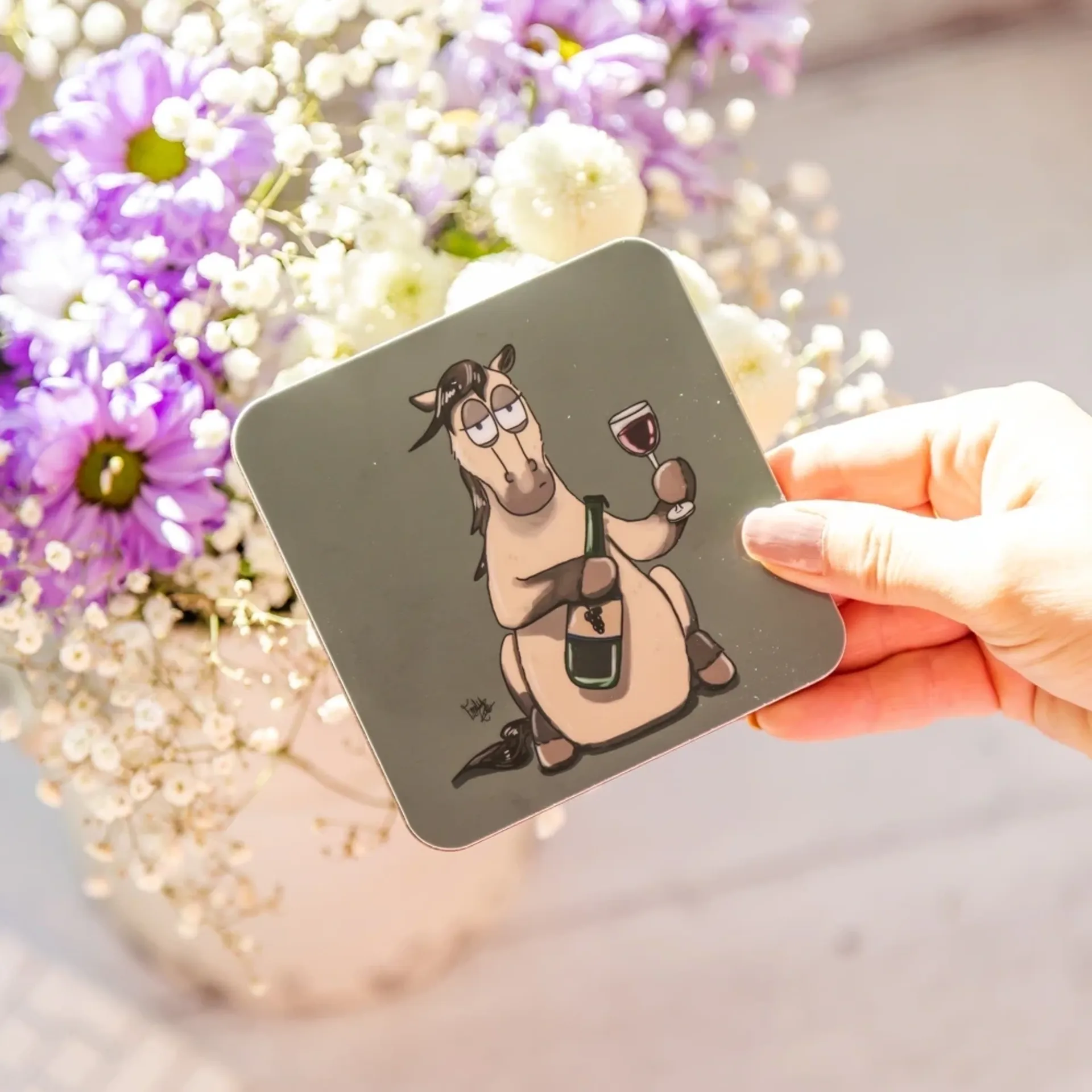 The Emily Cole Individual Coaster is a charming and whimsical addition to your home, capturing those memorable moments in the saddle—like when a pheasant nearly sent you flying!