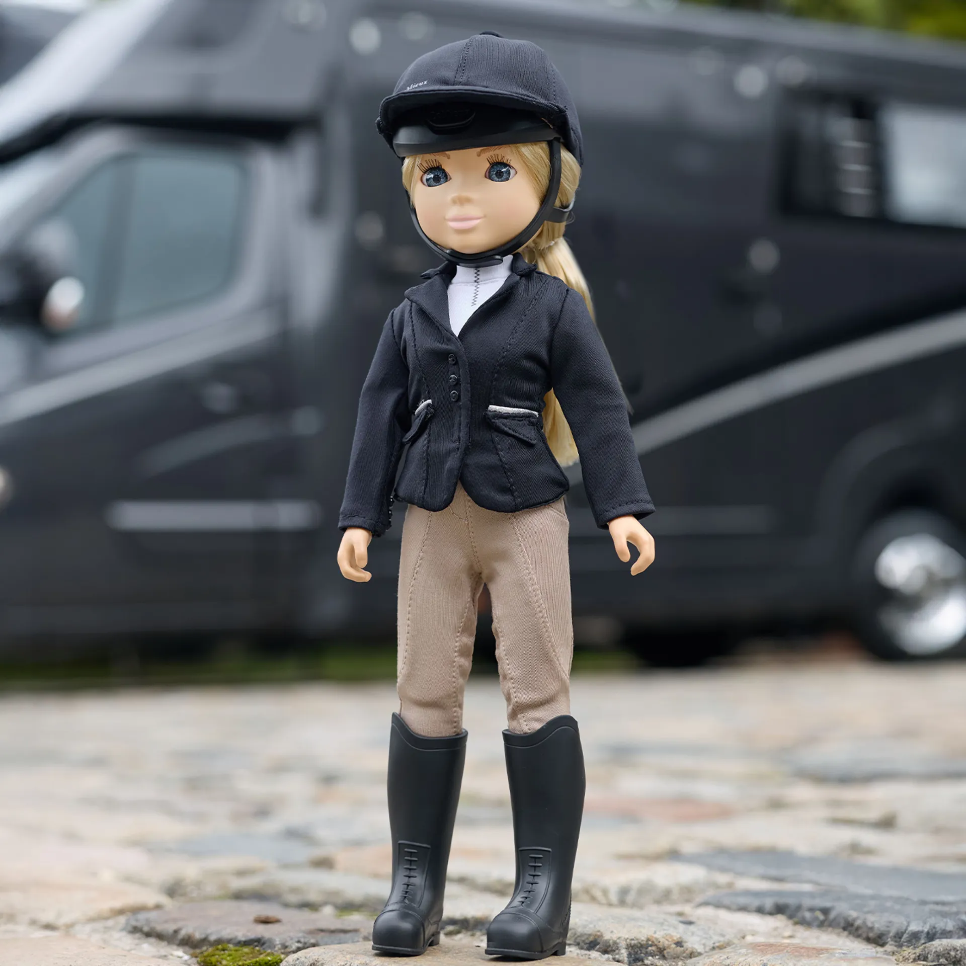 The LeMieux Toy Rider Competition Outfiit is designed with authentic detailing. This outfit brings miniature equestrian fashion to life, featuring a navy show jacket, white show shirt, beige breeches, and a navy hat silk. Every piece mirrors real equestrian competition wear, allowing your toy rider to perform in style.