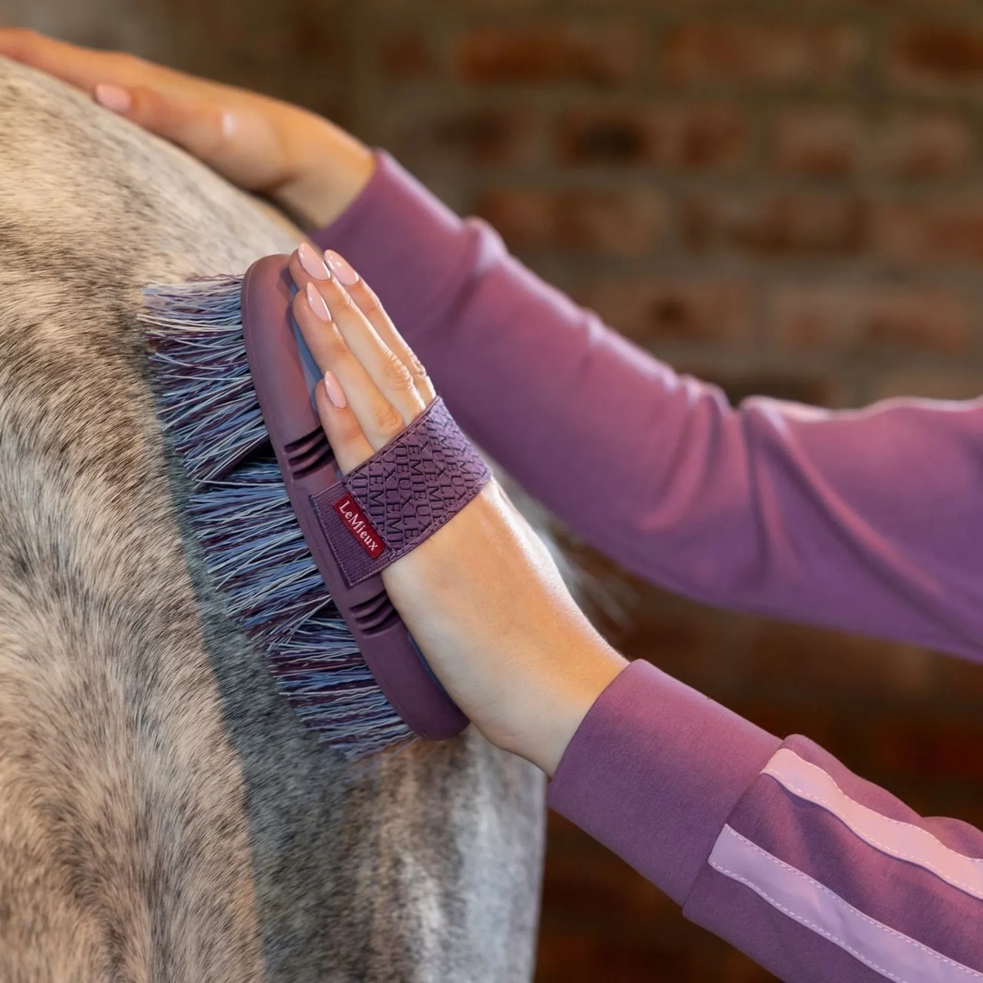 The long, flicky bristles which are perfect for flicking away dust and dirt from the coat, while the flexi shape reaches every contour with ease. The LeMieux Flexi Flicky Brush has an elasticated webbing strap makes it easy to hold.