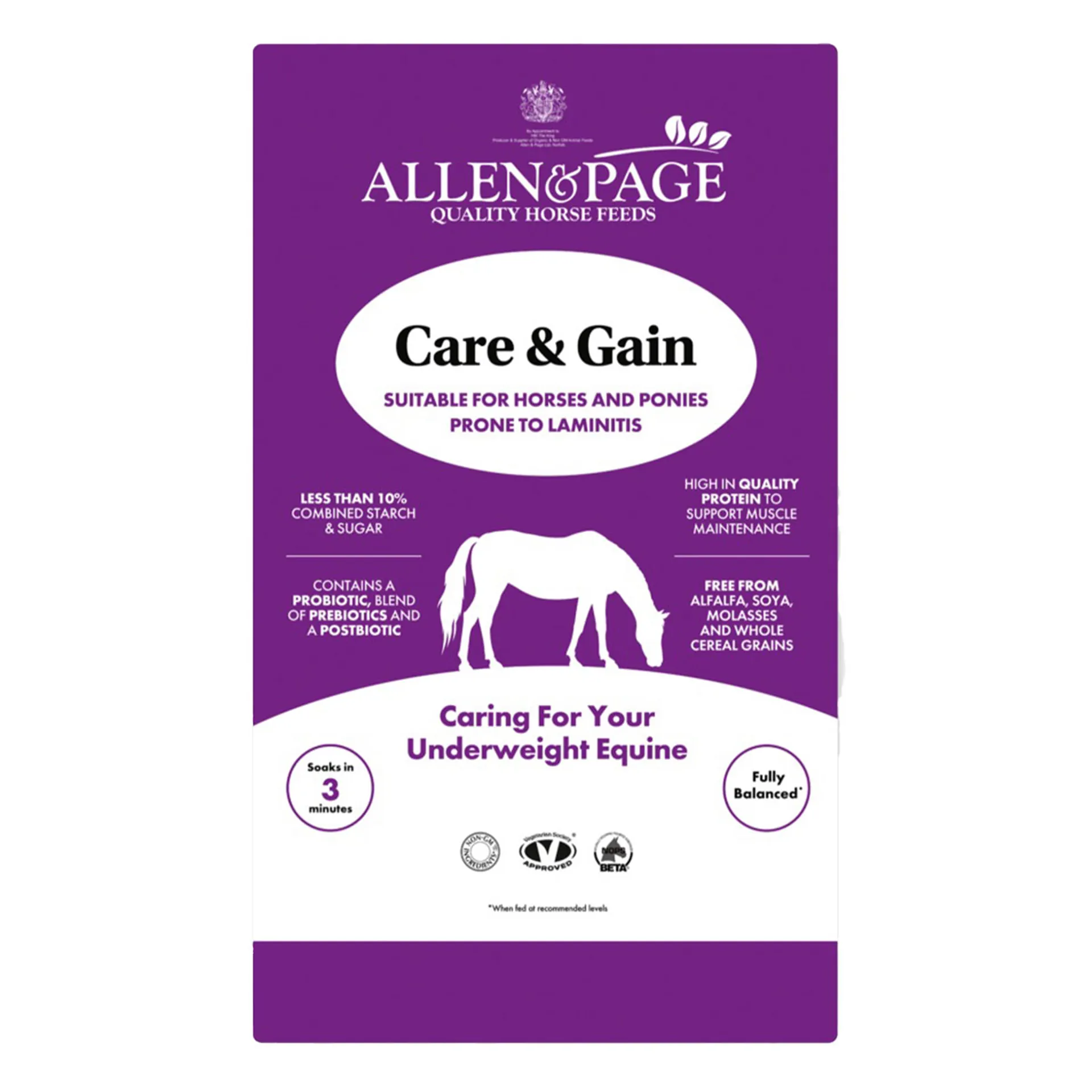 Care and Gain is suitable for horses and ponies who are underweight, prone to laminitis, at rest to medium work, requiring a low starch and sugar diet but high energy levels, poor doers who need a high calorie feed, those struggling to chew due to worn or missing teeth, and equines with intolerances to barley, molasses, alfalfa or soya.