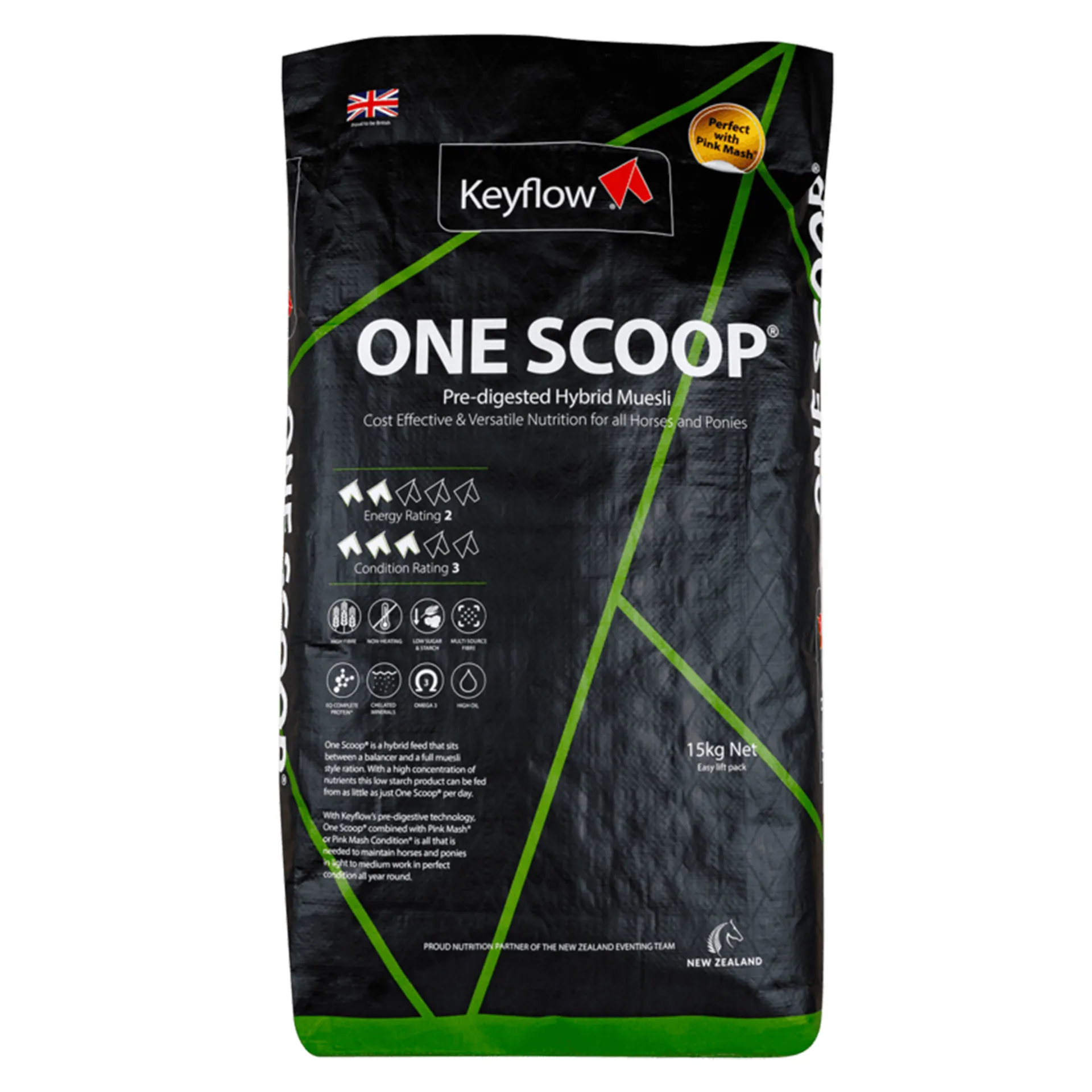 Low feeding rates deliver essential energy and protein while supporting condition and digestive health. Cost-effective and gentle on the gut, the Keyflow One Scoop® is perfect for light to moderate work.