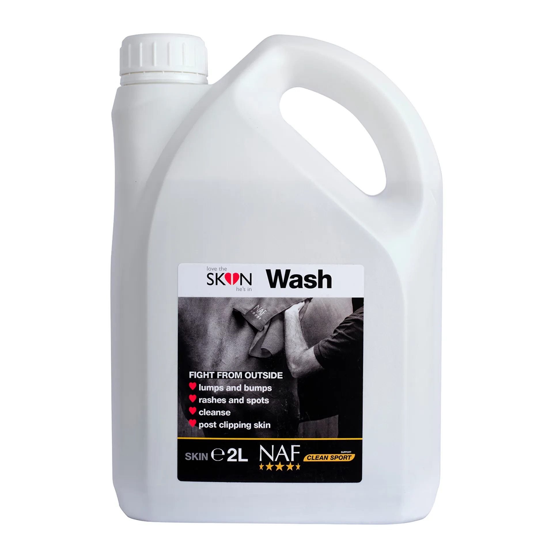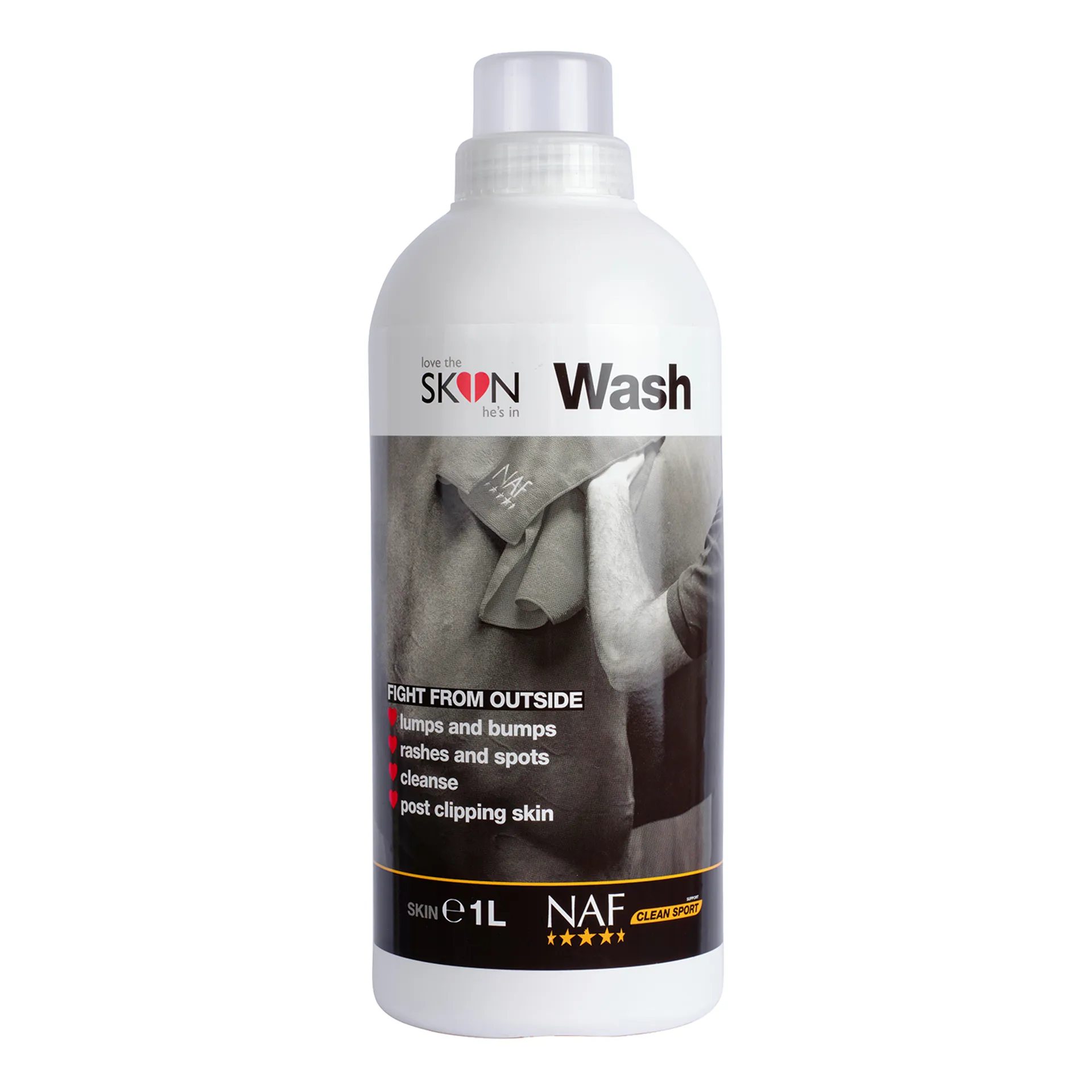 NAF Love the SKIN he's in Wash is a premium, natural skin care product for horses. Crafted with a gentle blend of herbal ingredients, including tea tree oil, it supports and soothes damaged or irritated skin caused by lumps, bumps, rashes, or mild irritations.