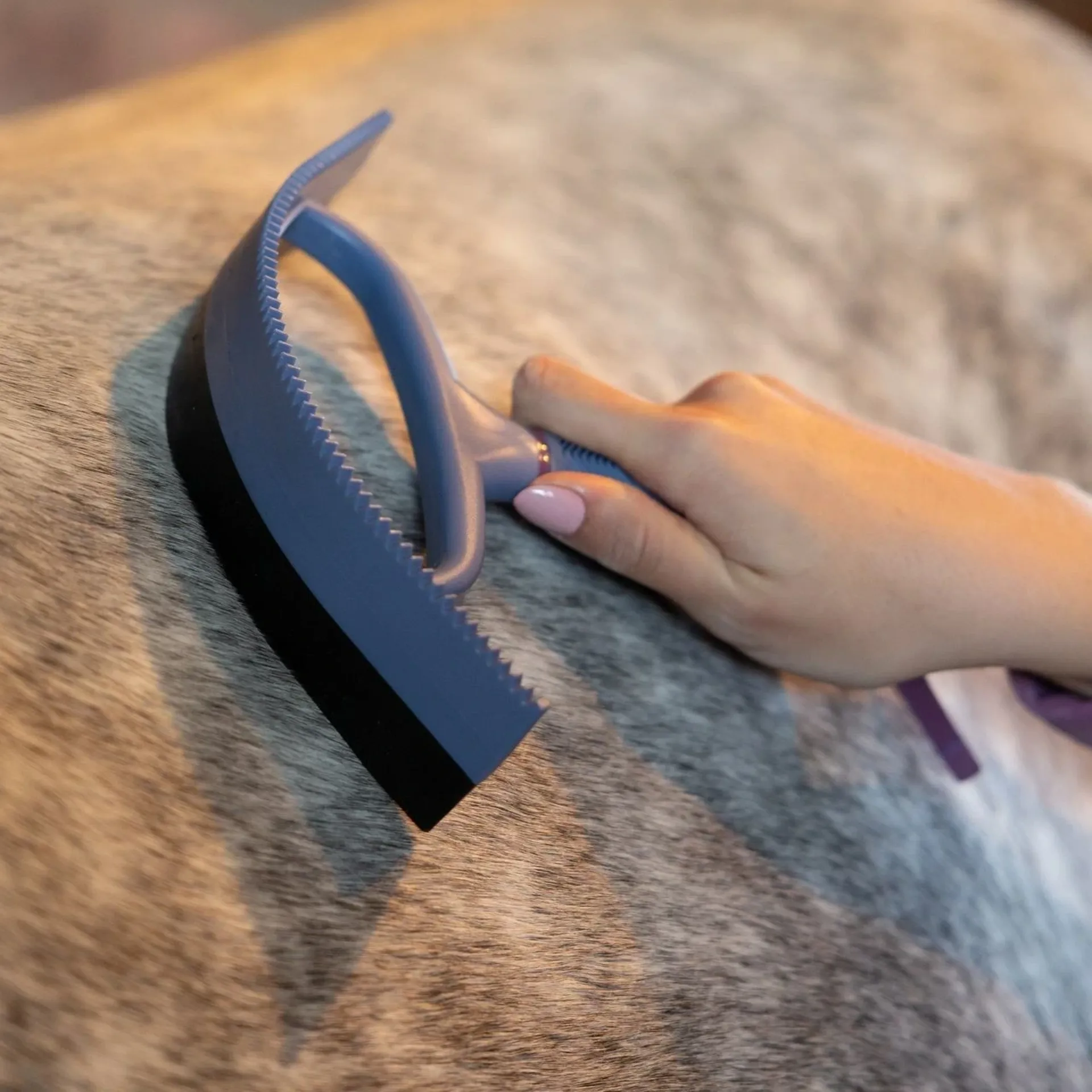 Its ergonomic handle offers a secure, comfy grip, while a hanging hole and silicone strap make it easy to store. The LeMieux Sweat Scraper must-have grooming tool for post-bath care and everyday use.