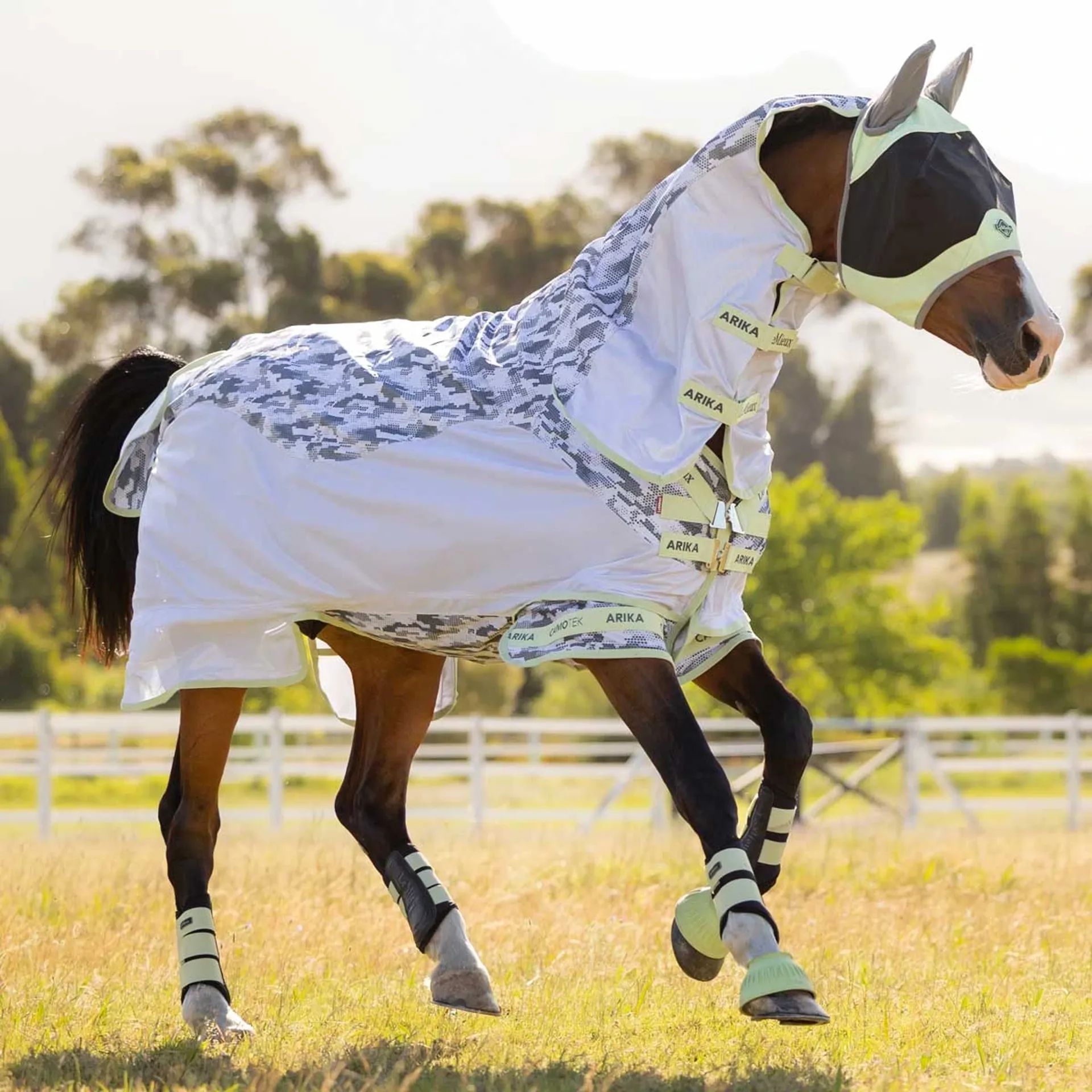 The high contrast camo-tek print confuses insects, making it difficult for them to perceive the horse's shape, offering superior protection when using the LeMieux Arika Camo-Tek Combo Neck Fly Rug. This rug also features a UV rating of 70+.