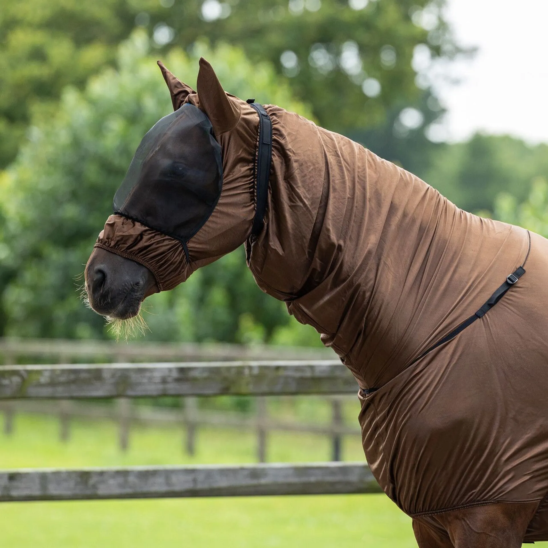 It has been manufactured with Velcro and clasps to fit with the QHP Sweet-Itch Combo Neck Fly Rug, but also features an additional strap for attaching to other rugs.