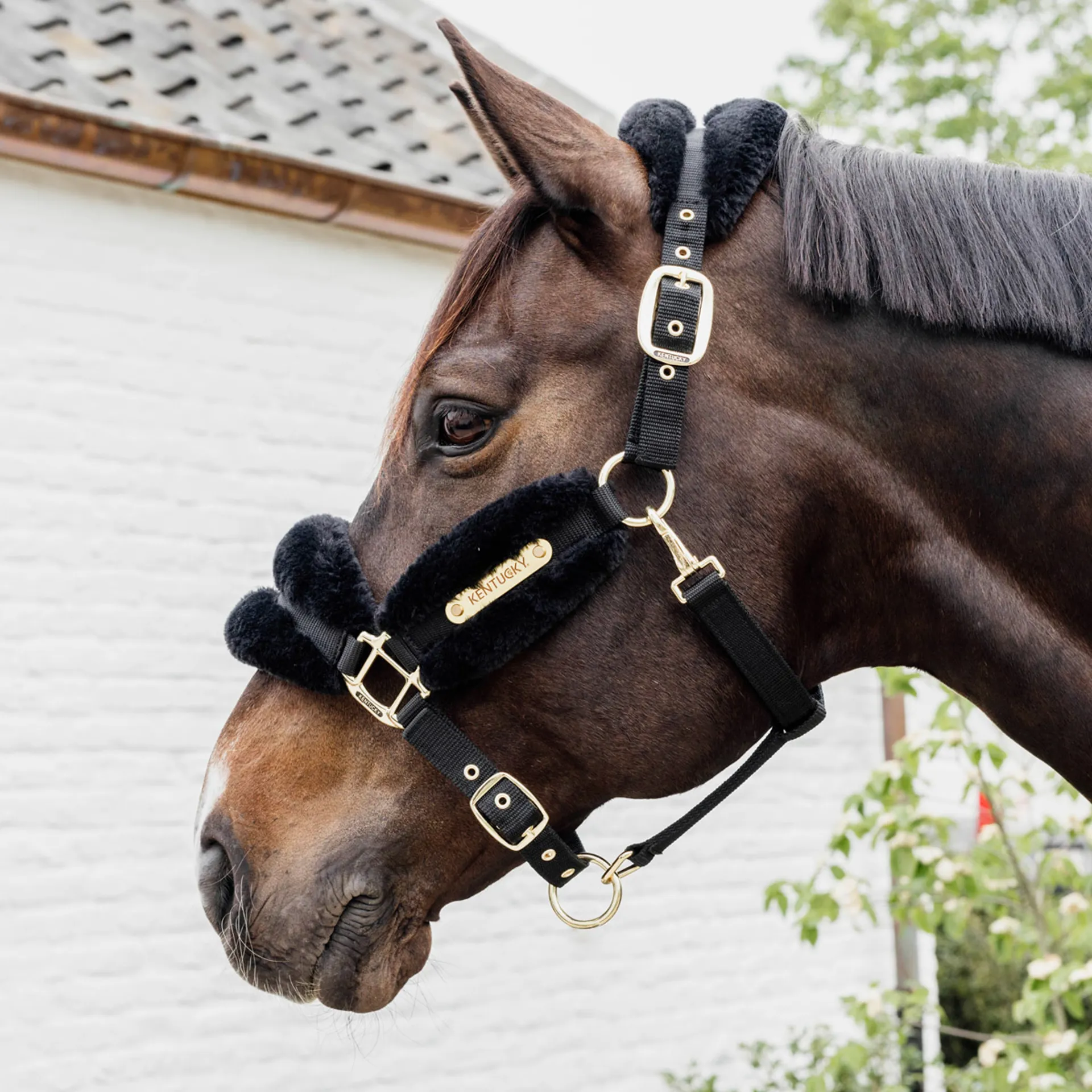 Perfect for transport or sensitive horses, the headcollar features a convenient carabiner hook at the cheek, allowing for easy attachment and detachment while maintaining security. The inclusion of a luxurious Kentucky plaque further underlines the headcollar's high-quality design, lending a touch of elegance to its functionality.
