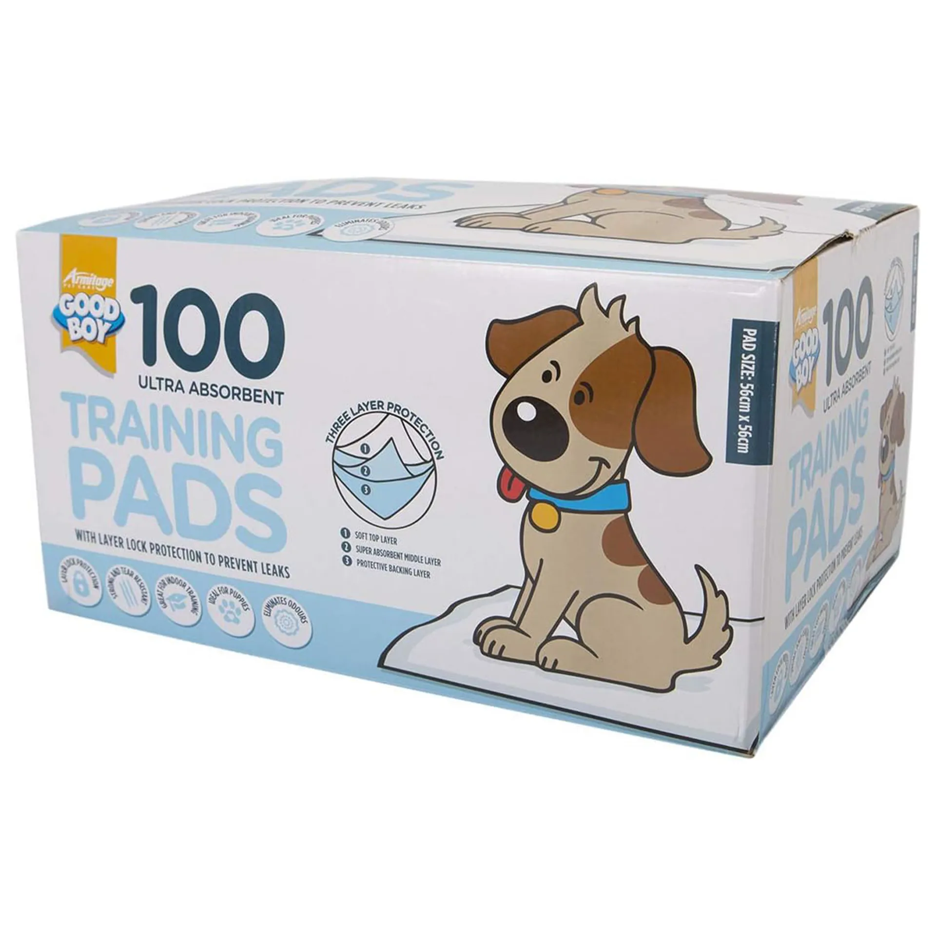 Ideal for house training, crates, or carriers—Good Boy Puppy Training Pads feature triple-layer lock protection with a soft top, super absorbent core, and protective backing.