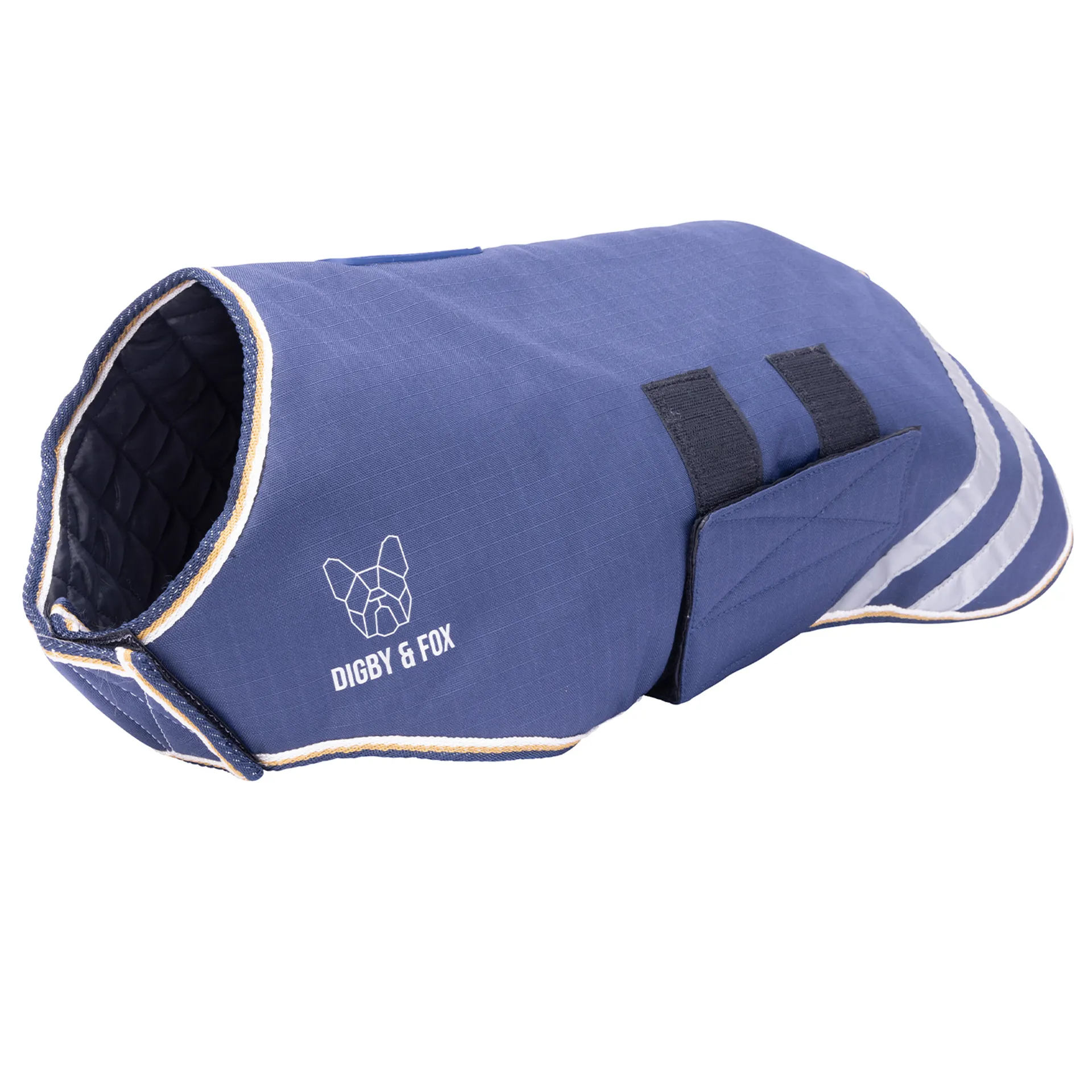 The Digby and Fox Waterproof Dog Coat. Designed for comfort and practicality, this coat features adjustable Velcro fastenings at both the front and middle, making it easy to fit a range of dog shapes and sizes. The breathable outer layer and soft, padded diamond-quilted lining ensure warmth and comfort, while reflective stripes add visibility during darker walks. Finished with subtle trim detailing and the signature Digby & Fox branding, it's a must-have for winter outings.