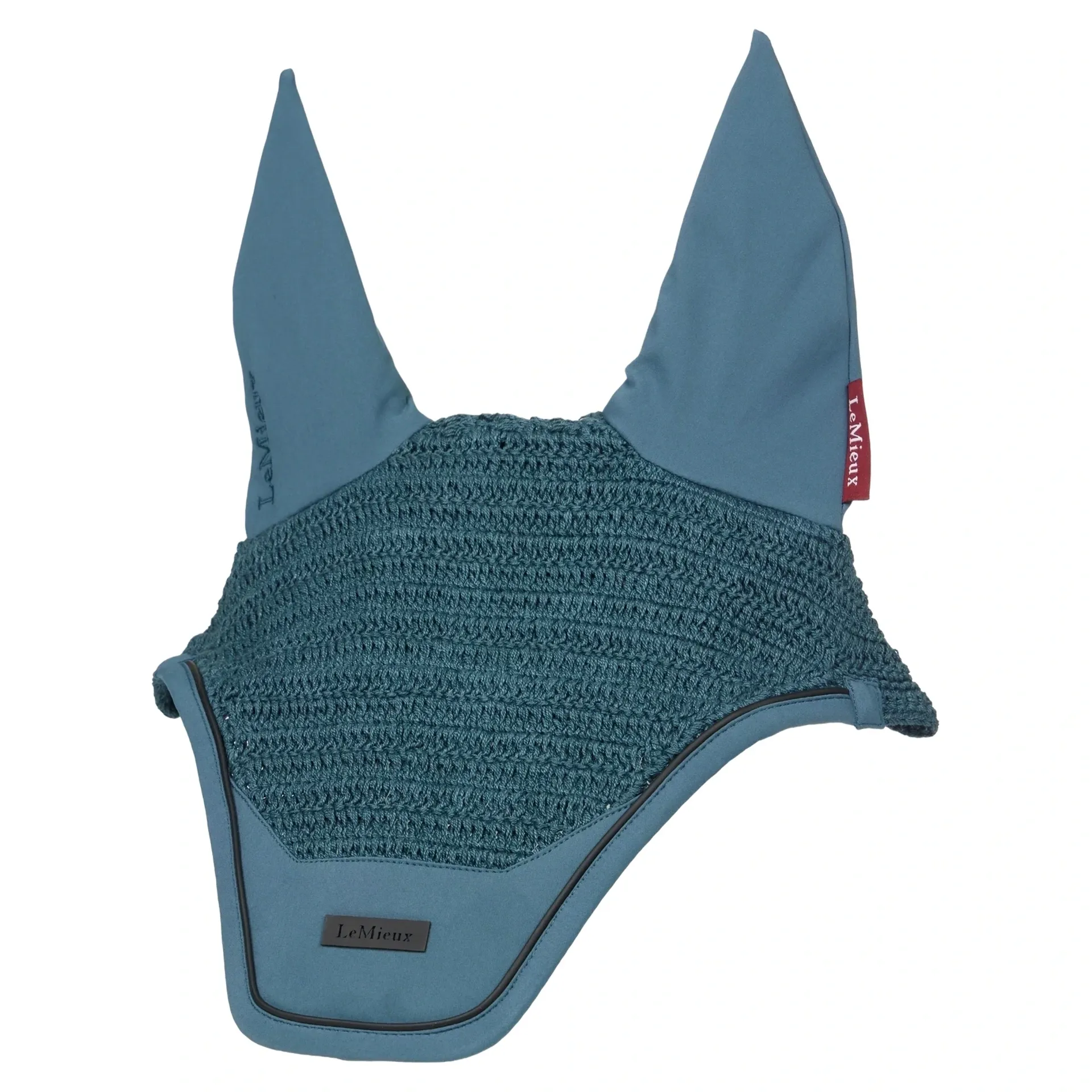 The soft elastane ear fabric shields against flies and dust, the LeMieux Essence Fly Hood blends elegance and protection, featuring handmade four-way stretch crochet, a softshell patch for stability, and silicone branding.