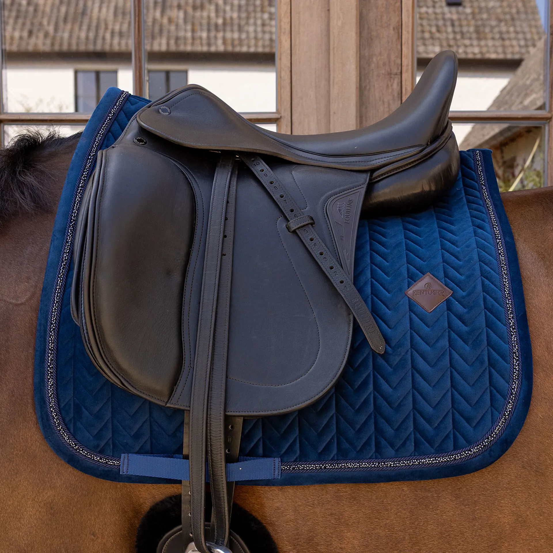 Add refined elegance to your ride with the Kentucky Velvet Mini Pearls Show Jump Saddlecloth, featuring luxurious velvet fabric, fishbone quilting, and discreet mini pearls for a sophisticated finish.