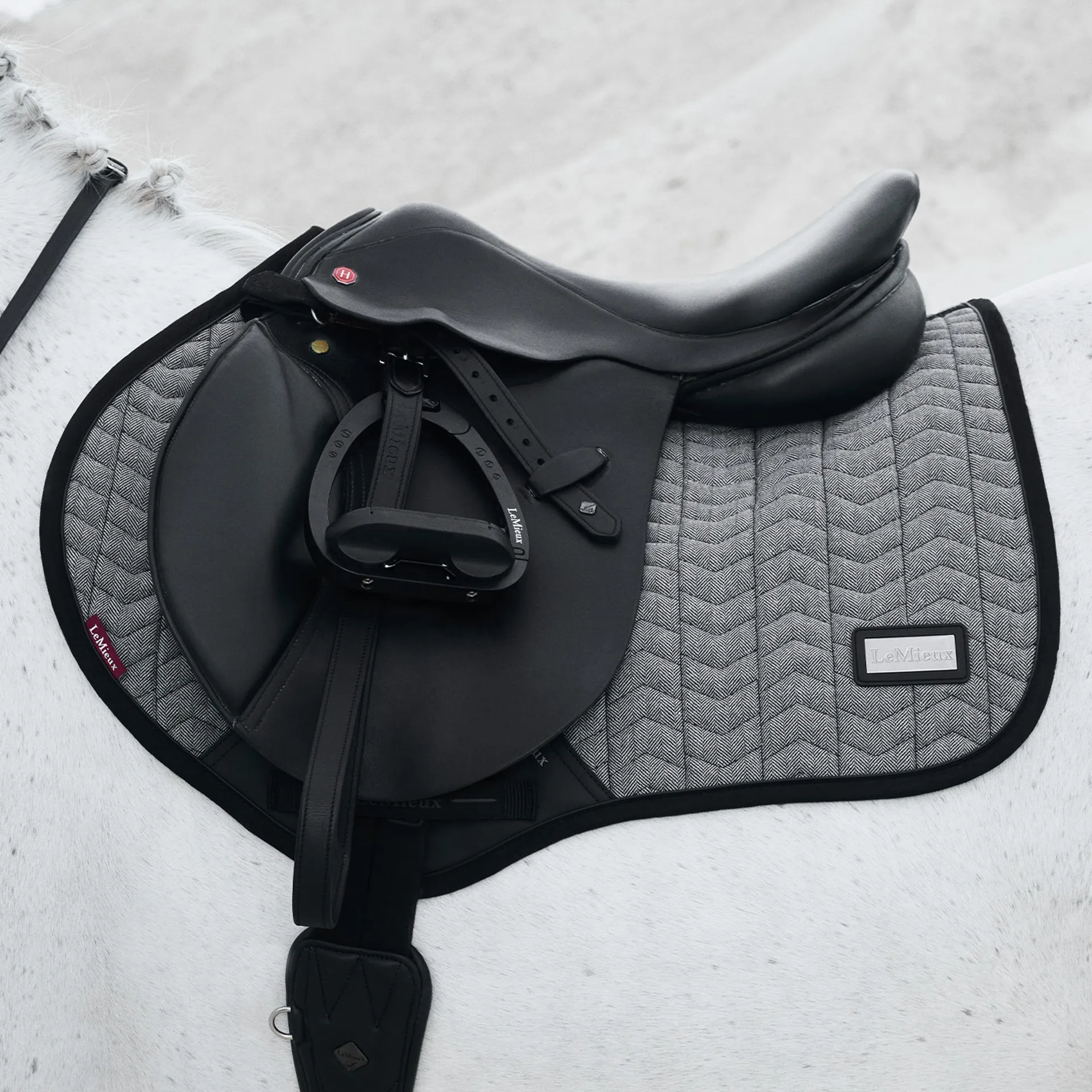 The LeMieux Aspen Close Contact Saddlecloth is crafted from luxurious houndstooth check fabric. This saddle pad combines elegance with high-performance design. Its unique Herringbone quilting, patent PU piping, and gunmetal LeMieux badge create a standout look, while practical features like friction-free suede-effect binding, antibacterial bamboo blend lining, and elasticated D-ring tabs ensure comfort and durability for both horse and rider.