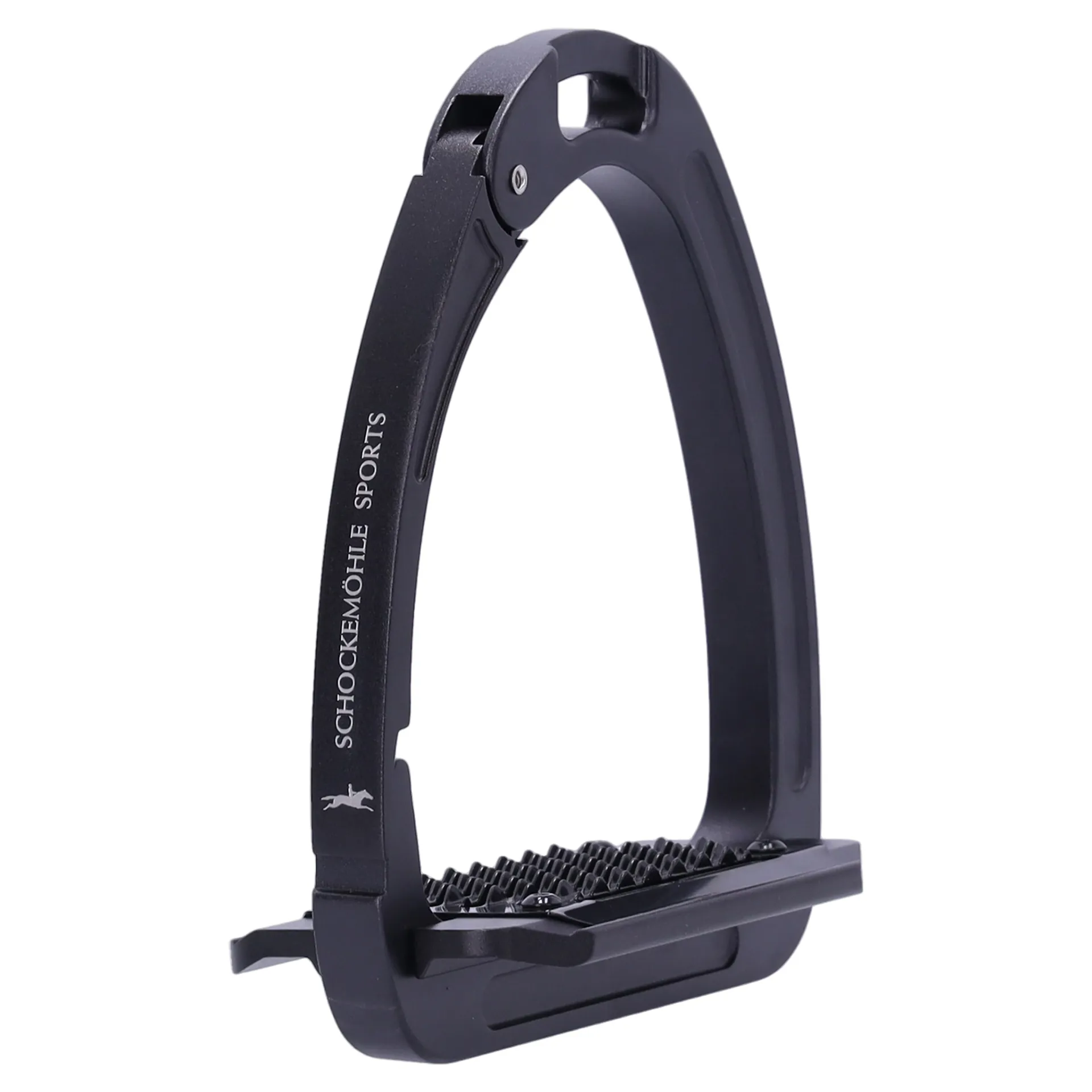 To enhance rider safety and comfort, these durable aluminium stirrups, the Schockemohle RevoGuard Stirrups, provide a secure, stable footing. They feature a quick-release arm and sloped tread to support correct positioning and reduce injury risk.